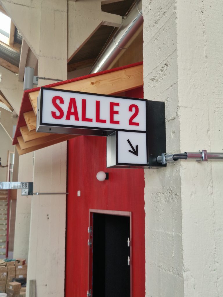 Dans le hall, on trouve beaucoup de bois et de rouge « qui réchauffent l’ambiance », et aucune borne automatique, « pour privilégier la vente à distance, mais surtout la caisse, qui entretient le lien avec les spectateurs ». Le grand espace “après-contrôle” promet, de son côté, de beaux moments de convivialité, « notamment lors de l’accueil d’équipes de films, en leur offrant un rapport au spectateurs différent de celui qui s’instaure à l’intérieur des salles ».