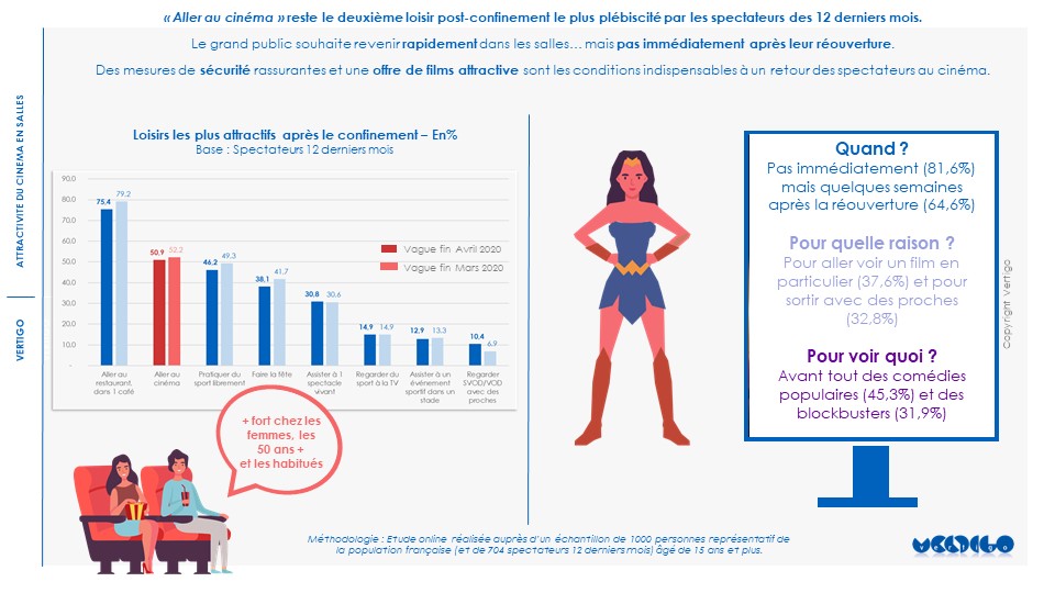 Dans cette nouvelle enquête réalisée fin avril, les positions ne changent pas et pour 50,9 % des sondés, aller au cinéma reste le deuxième loisir d’après confinement le plus attractif après aller au restaurant ou boire un verre dans un bar (75,4 %). Cette envie est davantage marquée chez les femmes (52,8 %), les personnes de plus de 50 ans (52,8 %), les spectateurs assidus (69,8 %), les réguliers (67,7 %) et dans la région parisienne (54,5 %). Si une légère baisse est enregistrée par rapport à fin mars, elle n’est pas seulement limitée au loisir cinéma mais à presque toutes les activités hors domicile, « comme s’il y avait une sorte de résignation ou de méfiance sur les loisirs impliquant un contact potentiel avec ses semblables. Il sera primordial de rassurer les spectateurs avec des mesures de protection clairement énoncées », explique Vertigo.