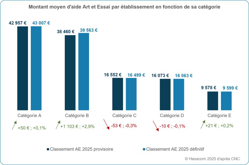 Sur l’ensemble du classement final, les principaux bénéficiaires du budget supplémentaire accordé sont les établissements de la catégorie B avec, en moyenne, 1 100 € de plus par cinéma (23 établissements dans cette catégorie, tous déjà classés en 2025). Dans les quatre autres catégories, les montants moyens d’aides sont restés quasiment identiques (augmentation ou baisse de quelques dizaines d’euros).