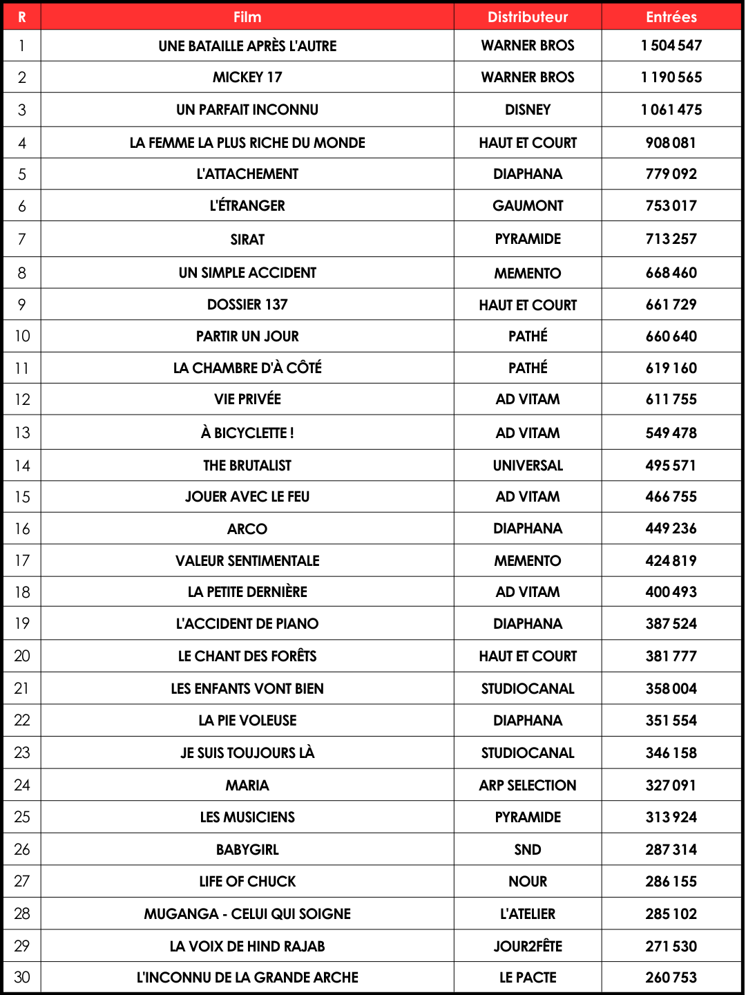 Au total, trois films ont dépassé le million de spectateurs en 2025 : Une bataille après l’autre (1,5 M), Mickey 17 (1,2 M) et Un parfait inconnu (1,1 M) pour un podium intégralement américain. En comparaison, quatre titres avaient franchi le million d’entrées en 2024, neuf en 2023, un seul en 2022 et deux en 2021.
