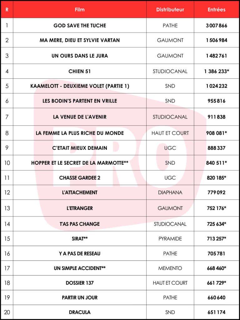 Les regards sont maintenant tournés vers 2026 qui s’annonce être un exercice bien plus dense, avec des vacances d’hiver rythmées par Les Légendaires et Gourou le 28 janvier, Marsupilami de Philippe Lacheau le 4 février ou encore LOL 2.0 de Lisa Azuelos le 11 février. Sont également attendues les deux parties de La Bataille de Gaulle les 10 juin et 1er juillet, qui tomberont à temps pour fêter le cinéma et l’été, le nouveau Toledano-Nakache, Juste une illusion, le 16 octobre, Les Misérables de Fred Cavayé le 9 décembre. Le tout sans oublier une production art et essai, de L’Affaire Bojarski (14 janvier) à Moulin (28 octobre), qui apportera à la fréquentation une diversité et son lot de succès qui fait tout le charme et l’unicité du marché français.