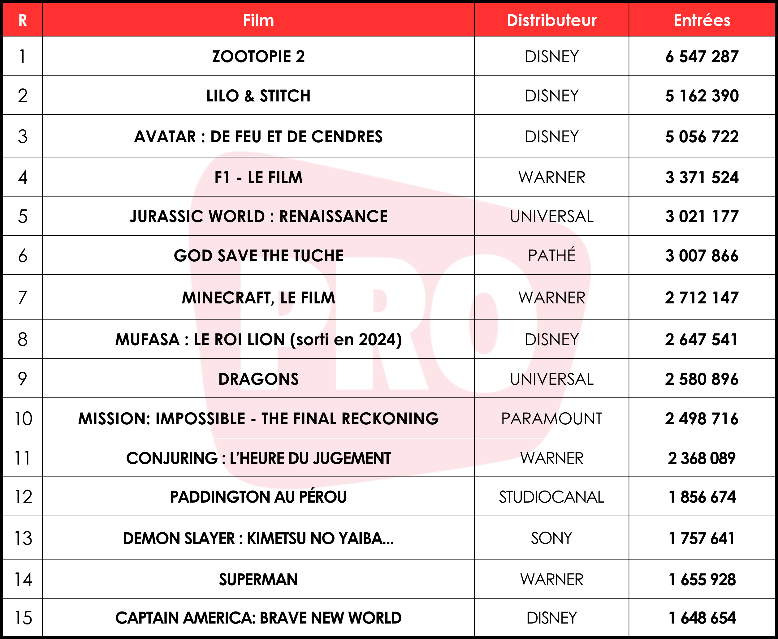 A l’image de ce dernier, certaines franchises présentes dans ce top ont montré des signes d’essoufflement et ne sont pas parvenues à réellement emballer le box-office, en témoignent les performances en demi-teinte de Jurassic World : Renaissance (3 M, 5e du classement 2025), Mission: Impossible – The Final Reckoning (2,5 M, 10e) ou encore Superman (1,7 M, 14e). D’autres ont affiché leur meilleur niveau, comme Conjuring : L’Heure du jugement (2 M, 11e) et Demon Slayer : Kimetsu No Yaiba – La Forteresse infinie (1,8 M, 13e), quand d’autres pourront s’appuyer sur des bases solides pour se déployer à l’avenir, telle F1 (3,4 M, 4e), Minecraft, le film (2,7 M, 7e) et Dragons (2,6 M, 9e). Seul représentant français du top 15, God Save The Tuche (3 M, 6e) signe un résultat médian au sein de la saga nordiste.