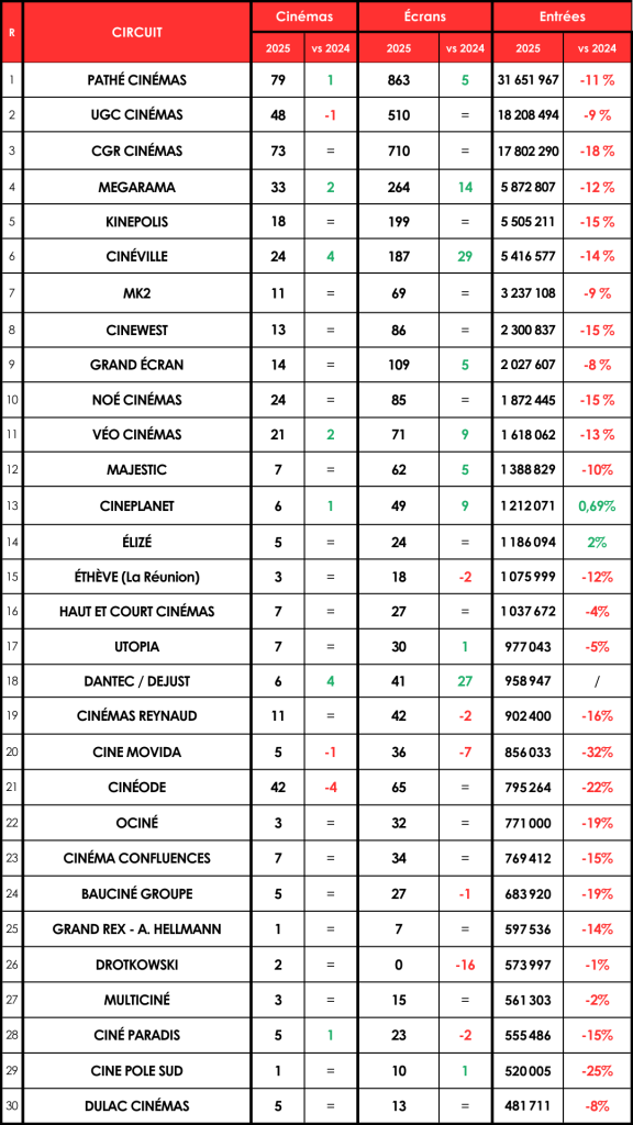 En cette année “de transition”, les principaux circuits français accusent tous une baisse de fréquentation, qui varie toutefois selon leur ligne éditoriale. Si Pathé Cinémas reste le leader incontesté, tant en nombre d’écrans que d’entrées – avec plus de 31,5 millions de spectateurs en 2025 –, UGC redevient le deuxième exploitant français en termes de fréquentation, avec une baisse mesurée de 9 % de ses entrées. En effet, dans un contexte de faiblesse de l’offre grand public, un circuit comme CGR accuse le coup, avec 18 % de baisse, quand ceux programmant davantage d’art et essai s’en sortent mieux, à l’image de mk2 (-9 %), ou encore des réseaux comme Haut et Court Cinémas (-4 %) ou Utopia (-5 %).