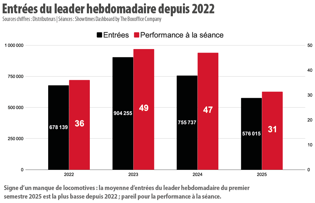 De son côté, Éric Marti constate que « nous avons traversé deux mauvaises périodes par rapport à d’habitude : les vacances d’hiver, et du début avril à la mi-mai. Ce sont des moments où ont manqué un blockbuster américain, une comédie populaire ou un très gros dessin animé qui, normalement, dominent le marché ». En effet, en l’absence de moteur, la fréquentation n’a dépassé le cap des 4 millions d’entrées hebdomadaires qu’une fois… à savoir la semaine du 1er janvier – contre respectivement trois fois et sept fois sur les premiers semestres de 2024 et de 2023.