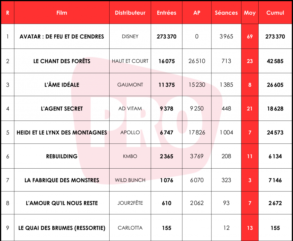 Avatar : De feu et de cendres enregistre 273 370 entrées sur son premier jour, soit le meilleur démarrage de l’année, devant Lilo & Stitch (260 000 entrées). Un résultat dans la lignée de celui de Avatar : La Voie de l’eau, qui s’était lancé à 250 000 entrées mais concurrencé par le match de Coupe du monde France-Maroc dans la soirée. Le nouvel opus était programmé hier sur 3 965 séances, soit le plus grand nombre pour une sortie depuis 2021 après celui de La Voie de l’eau (4 022 séances), ce qui ne l’empêche pas d’afficher une belle moyenne de 69 entrées par séance (e/s), la troisième plus forte de 2025, devant Conjuring : L’Heure du jugement (68 e/s). Côté box-office, Disney annonce 2,9 M€, ce qui laisse entendre un coût moyen de ticket élevé et un gros succès dans les salles premium. On attend maintenant les résultats du week-end, qui sera propice à un film d’une durée de 3h20.