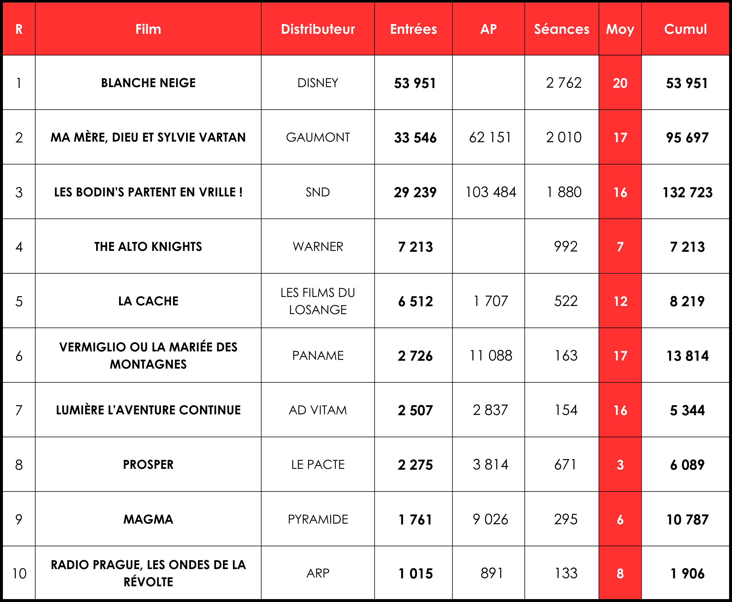 Avec 53 000 entrées et sans avant-premières (AP), Blanche Neige obtient une moyenne de 20 entrées par séance (e/s) pour son premier jour. Le live action de Marc Webb (The Amazing Spider-Man, Mary) se situe bien en-deçà des 140 000 entrées du récent Mufasa : Le Roi Lion ou des 85 000 entrées de Cendrillon (2015) et Maléfique (2014), plutôt à hauteur d’une Cruella (44 000 entrées, 20 e/s en juin 2021). En décembre dernier, chez Universal, Wicked avait réalisé 33 000 entrées, mais 87 000 avec AP (actuellement à 850 000 entrées).