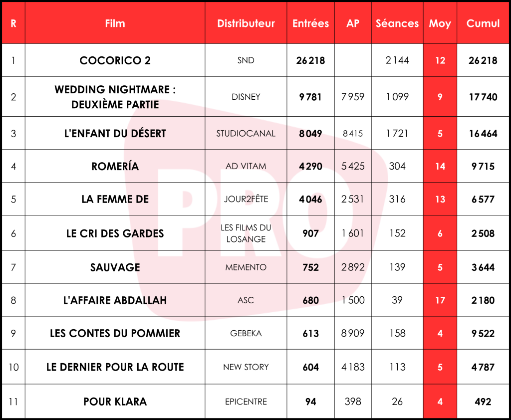 À noter que L’Affaire Abdallah de Pierre Carles, distribué par ASC, affiche la meilleure moyenne des nouveautés avec 17 entrées par séance, symbole d’une fréquentation relativement calme mercredi.