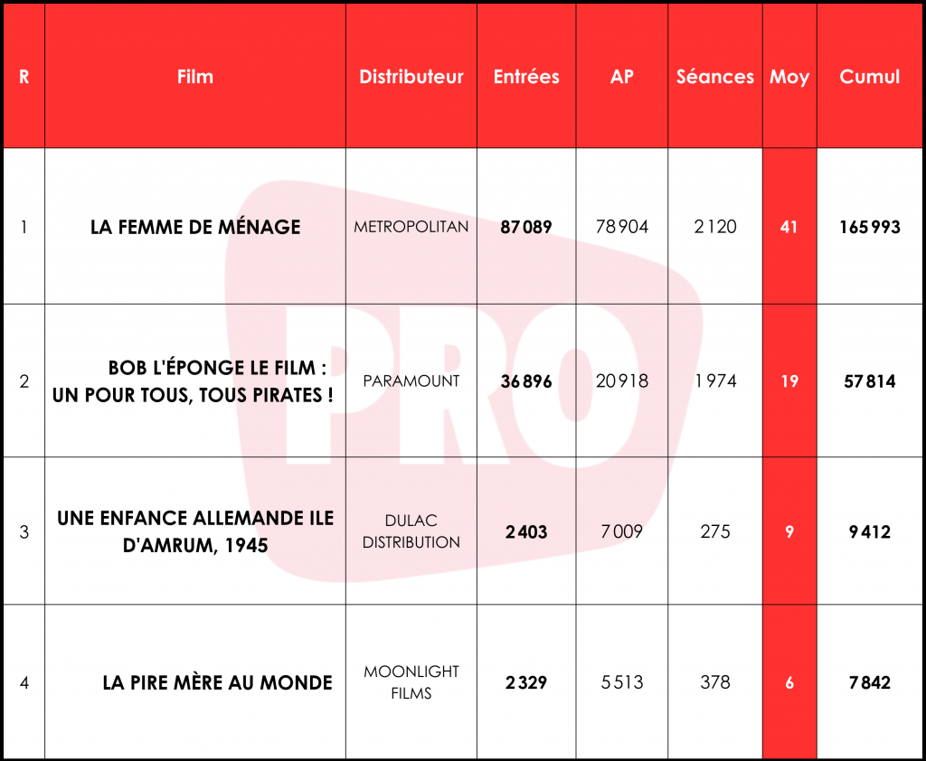 La moindre forme du marché mercredi dernier semble avoir plus atteint Bob l’Éponge le film : Un pour tous, tous pirates !, qui attire 36 800 entrées (57 800 avec AP) pour 19 e/s. Ce premier jour est ainsi bien en-dessous des Schtroumpfs qui, en juillet dernier, avait connu un fort démarrage (115 000 entrées pour 54 e/s) avant de redescendre un peu pour le week-end (433 000 entrées pour 42 e/s), et de terminer sa route à 1,6 million de tickets. Ce Bob l’Éponge s’en sort ainsi au niveau de Vaillante, sorti en 2022 (35 300 entrées pour 19 e/s, cumul à 1,3 million) ou Les Trolls 2 : Tournée mondiale (38 700 entrées pour 17 e/s, cumul à 1 million), sorti peu de temps avant la deuxième fermeture des salles.