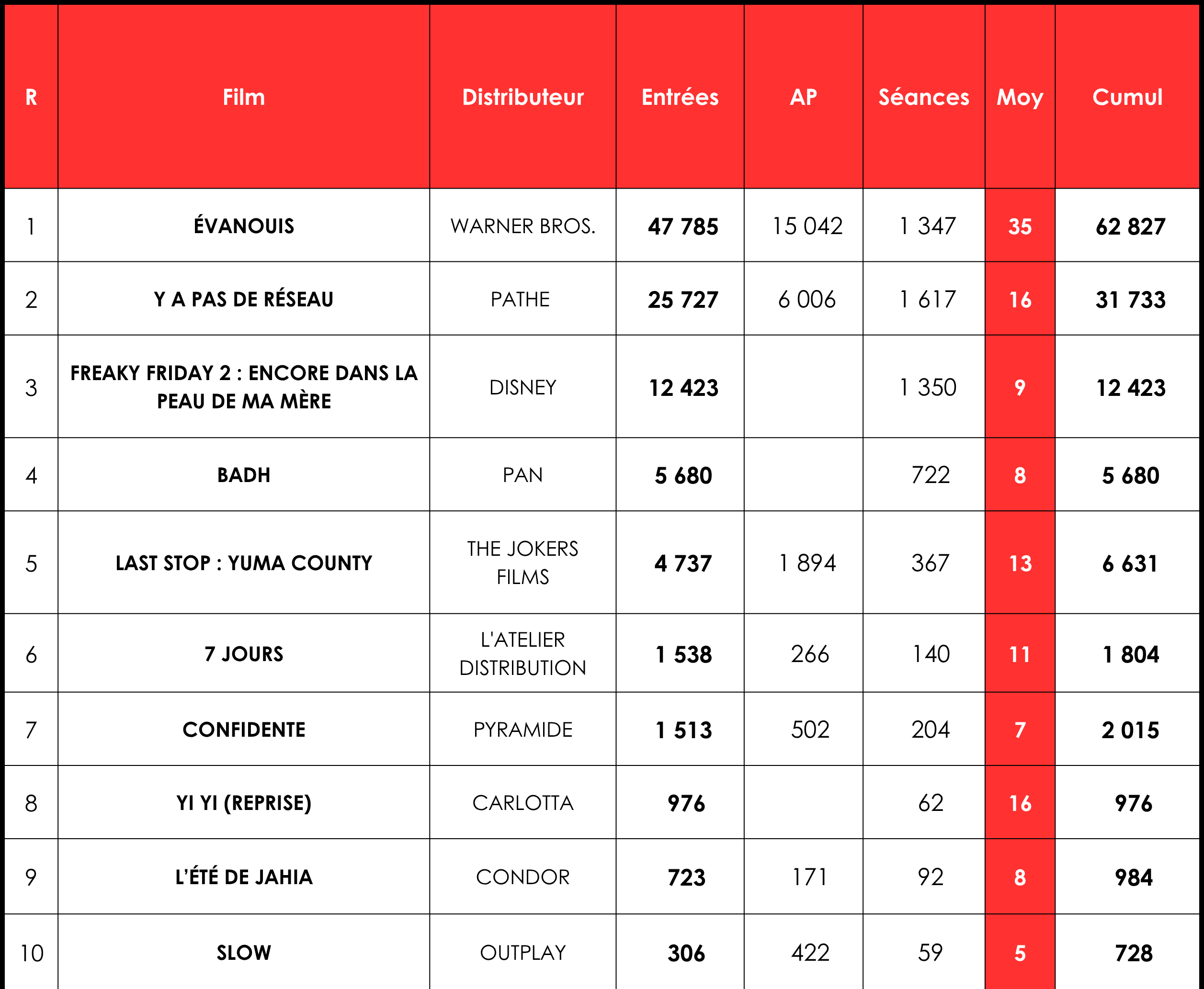 Ils sont près de 26 000 à avoir opté pour la comédie familiale française Y a pas de réseau. En avril 2024, Ducobu passe au vert avait réuni plus de 30 000 spectateurs sur son premier mercredi, avant de terminer sa carrière aux portes du million d’entrées, déjà en compagnie de Gérard Jugnot. Même si sa filmographie est pour l’heure moins longue, l’humoriste Maxime Gasteuil, en duo avec Jugnot Y a pas de réseau, avait attiré 16 500 spectateurs sur le premier jour de son premier film au ciné, 14 jours pour aller mieux… déjà réalisé par Edouard Pluvieux.