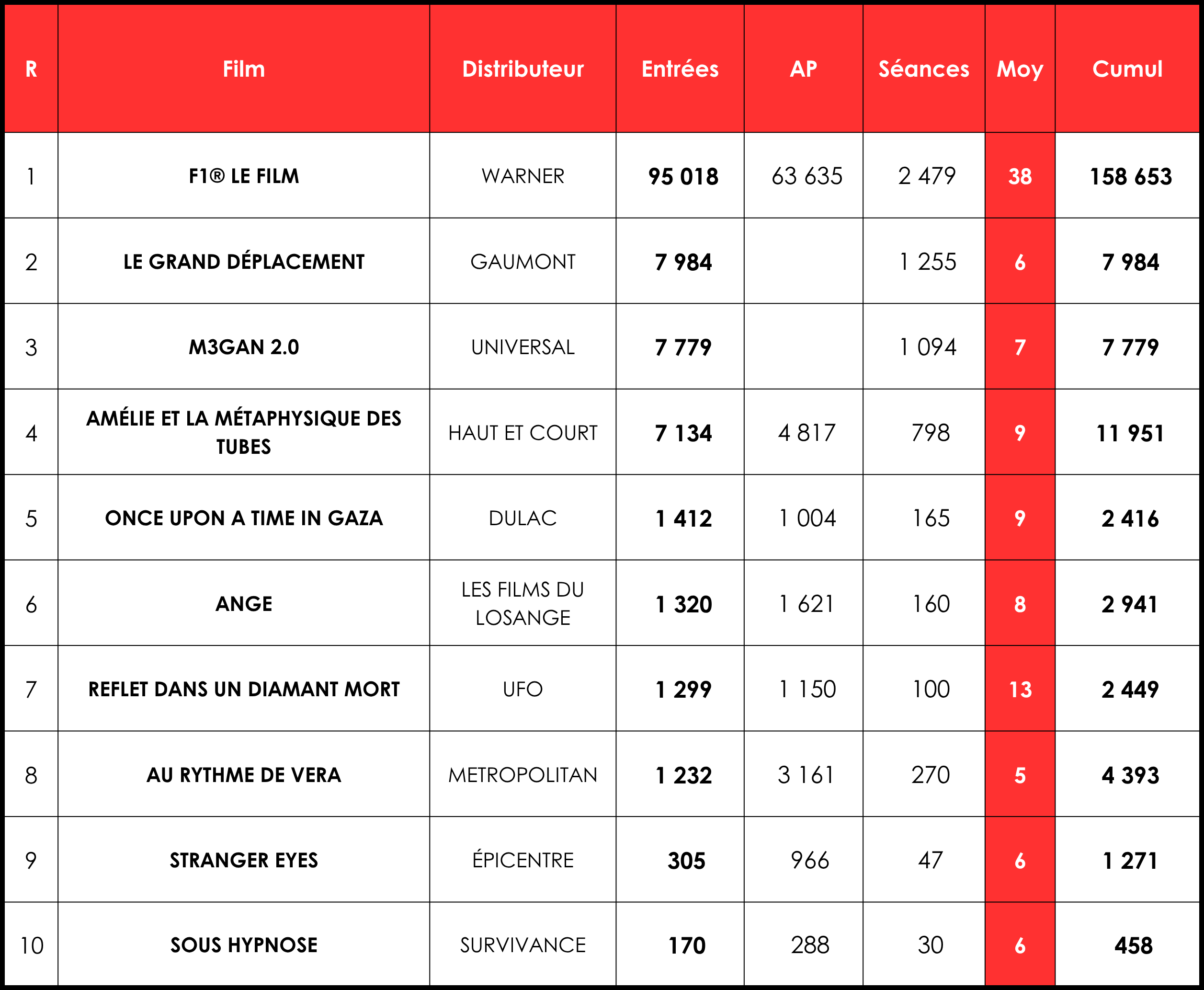 Le top 10 des nouveautés récolte une moyenne de 19 e/s… même si la moitié des titres réalisent moins de 8 e/s. F1 le film rafle 77 % des 124 000 entrées de ce classement, en hausse de 40 % par rapport à la semaine précédente et de 97 % par rapport à la semaine équivalente de 2024 – neuf sorties, sachant que Le Comte de Monte Cristo allait sortir 2 jours plus tard, soit un vendredi, tout comme 13 jours 13 nuits cette année. Il ne reste plus qu’à voir qui tirera son épingle du jeu pour la Fête du Cinéma !