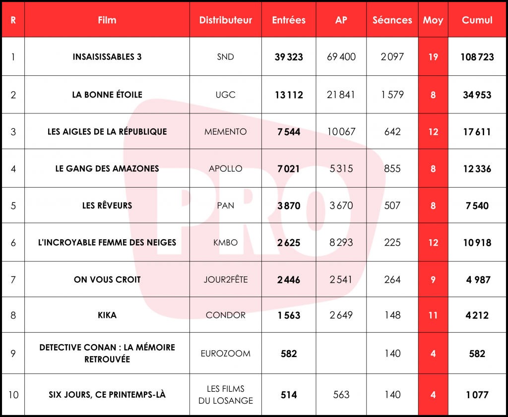 Chez Apollo, Le Gang des Amazones de Mélissa Drigeard écoule 7 000 tickets (8 e/s) et quelque 12 000 avec AP. La précédente réalisation de la cinéaste, Hawaï, avait réuni 10 000 curieux (6 e/s) et 13 000 avec AP en 2023 (cumul final à 125 000 entrées), tandis que Les Femmes au balcon de Noémie Merlant avait vendu 5 600 billets (11 e/s) et 12 000 avec AP en 2024, pour tutoyer les 100 000 entrées au final.
