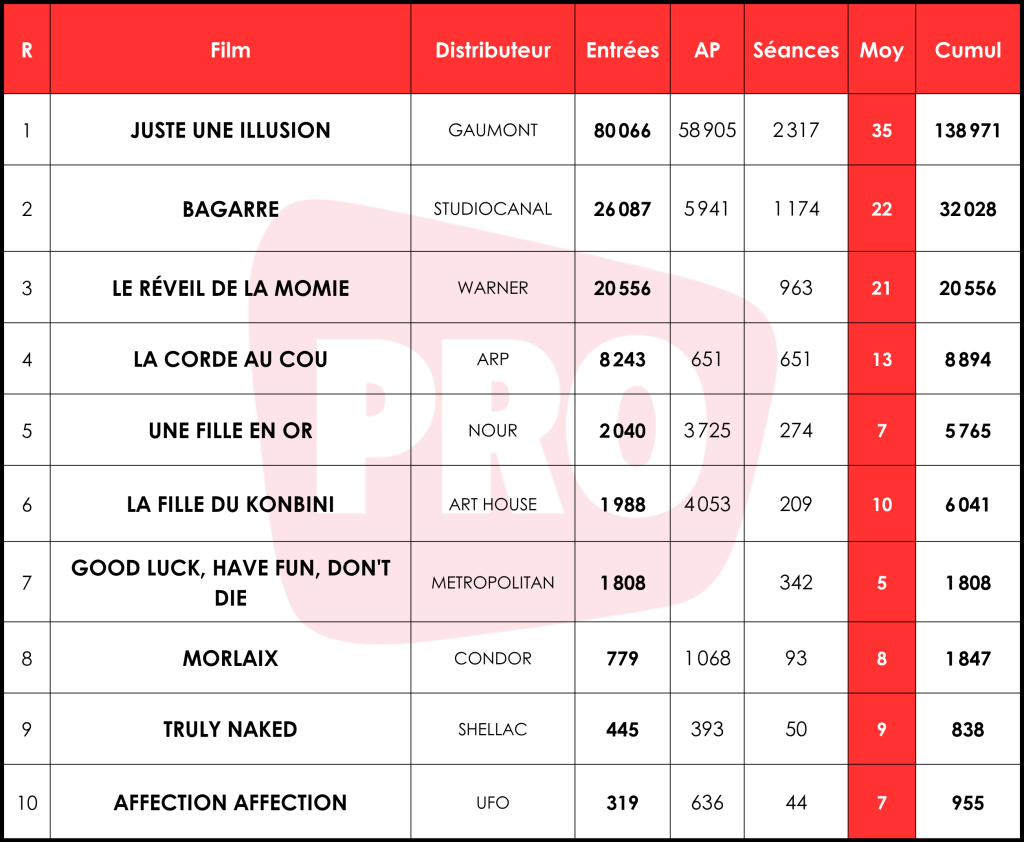Retour en grâce pour Toledano et Nakache. Juste une illusion boucle son premier jour à 80 000 spectateurs (138 000 avec AP) pour une très bonne moyenne de 35 entrées par séance (e/s), et devance largement les 43 000 entrées pour 19 e/s de Une année difficile. Leur précédent long métrage, sorti en octobre 2023, avait en effet connu un accueil mitigé, et était devenu leur premier film depuis Tellement proches (2009) à ne pas atteindre le million de spectateurs. Juste une illusion part sur des bases bien supérieures en devançant le premier jour de Hors normes (72 000 entrées pour 34 e/s) et du Sens de la fête (69 900 entrées pour 32 e/s), qui ont respectivement terminé à 2,1 M et 3 M de spectateurs. Il s’agit en outre, hors AP, du troisième meilleur démarrage de l’année, après Scream 7 (94 000 entrées pour 48 e/s), et du deuxième meilleur pour un titre français, après Marsupilami (119 000 entrées pour 34 e/s). Le film de Gaumont bénéficie également de très bons retours spectateurs, lui promettant un bouche-à-oreille solide dans les semaines à venir.