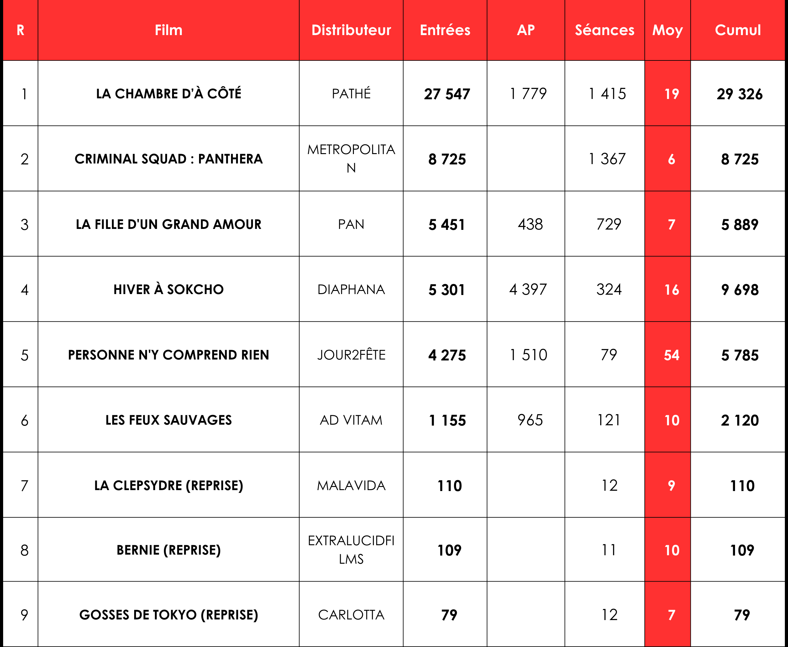 Le top 9 des nouveautés récolte 52 750 entrées, soit une baisse de 47 % par rapport aux neuf premières nouveautés de la semaine précédente. À noter, plus de la moitié de ces entrées sont récoltées par La Chambre d’à côté, ce qui était déjà le cas la semaine dernière avec Un ours dans le Jura.