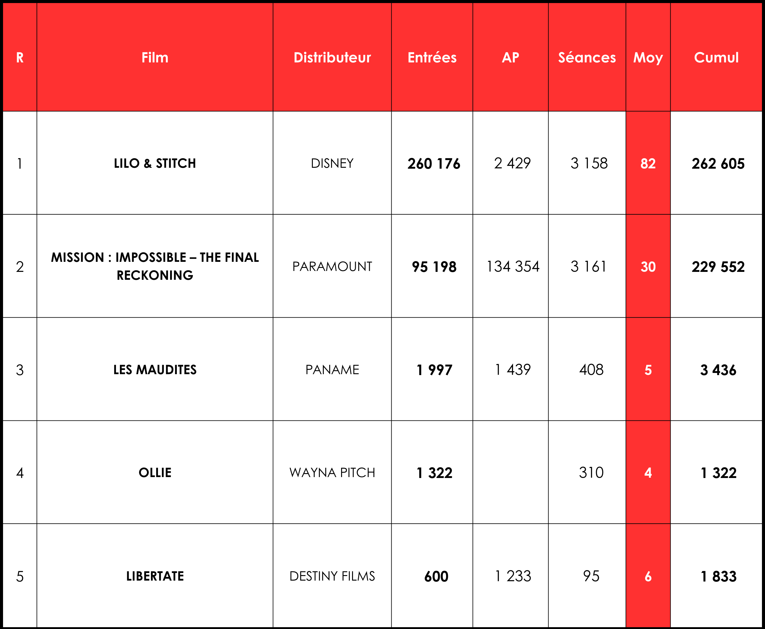 Parmi les cinq sorties de ce mercredi, le live-action Disney réalise le meilleur démarrage de l’année, tandis que Mission impossible : Final Reckoning gagne la deuxième place.