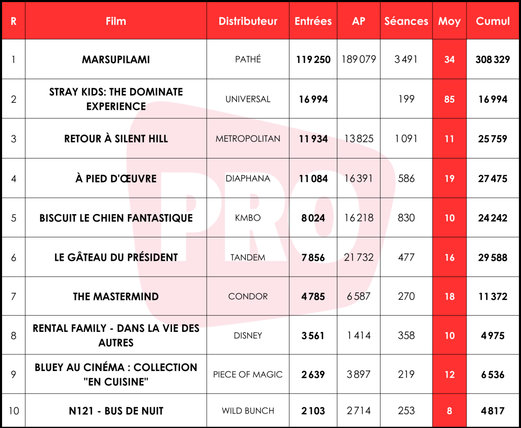 119 250 spectateurs ont découvert le Marsupilami de Philippe Lacheau, pour un total de plus de 308 000 avec les avant-premières (AP), et une moyenne de 34 entrées par séance (e/s). La sortie de Pathé réalise le meilleur lancement français depuis… les 252 000 entrées de Un p’tit truc en plus, en mai 2024, et avec le renfort de la plus grande combinaison de séances pour un titre tricolore post-Covid, devant les 3 450 séances de Astérix et Obélix : L’Empire du Milieu. La comédie de Philippe Lacheau n’atteint toutefois pas les niveaux du film de Guillaume Canet, qui avait écoulé 191 000 tickets pour 55 e/s (cumul à 4,6 millions), mais devance Alibi.com 2 (92 000 entrées pour 33 e/s, cumul à 4,2 millions). Autre réalisation de la Bande à Fifi, 3 jours max avait démarré à 112 000 entrées pour 40 e/s, mais avait terminé à 1,9 M. Ainsi, les très bons retours des spectateurs (4/5 sur AlloCiné) laissent espérer un bon bouche-à-oreille, qui pourra également être dynamisé par les vacances scolaires.