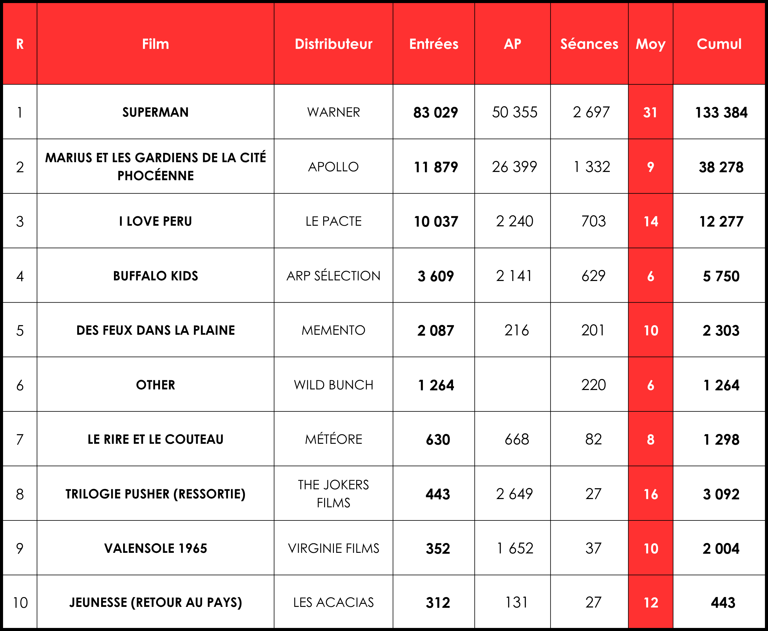 Au total, le top 10 des nouveautés cumule 113 000 entrées, pour une moyenne de 19 e/s… sachant qu’un film sur deux ne dépasse pas 10 e/s. En 2024, le top 10 de la semaine équivalente comptait 240 000 billets (dont 210 000 pour Moi, moche et méchant 4), soit une baisse de 53 %, quand 2023 enregistrait 160 000 billets des nouveautés (-29 %), dont 130 000 pour Mission: Impossible – Dead Reckoning part 1.