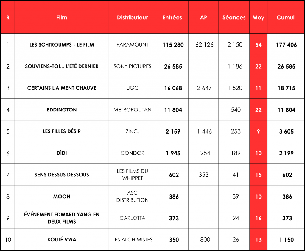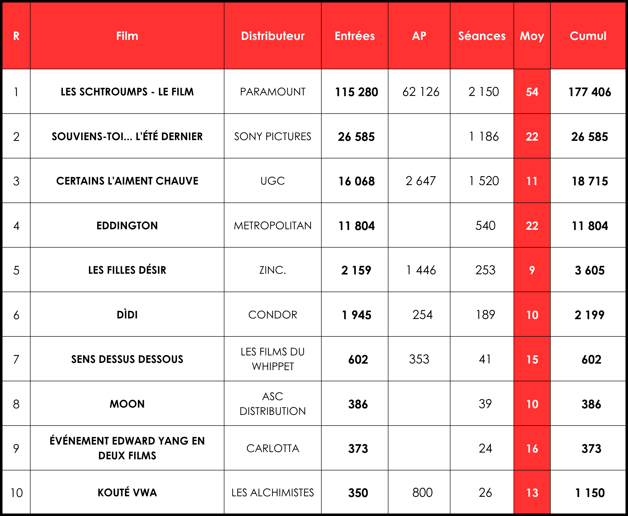 Au total, le top 10 des nouveautés engrange 175 000 entrées, soit une hausse de 54 % par rapport à la semaine dernière et de 140 % par rapport à la semaine équivalente de 2024. Pour rappel, en 2023, le top 10 comptabilisait 450 000 entrées, grâce au duo Barbenheimer. À noter que la fréquentation à la séance, de 29 e/s, est à son plus haut niveau depuis la sortie de Lilo & Stitch (42 e/s) fin mai.