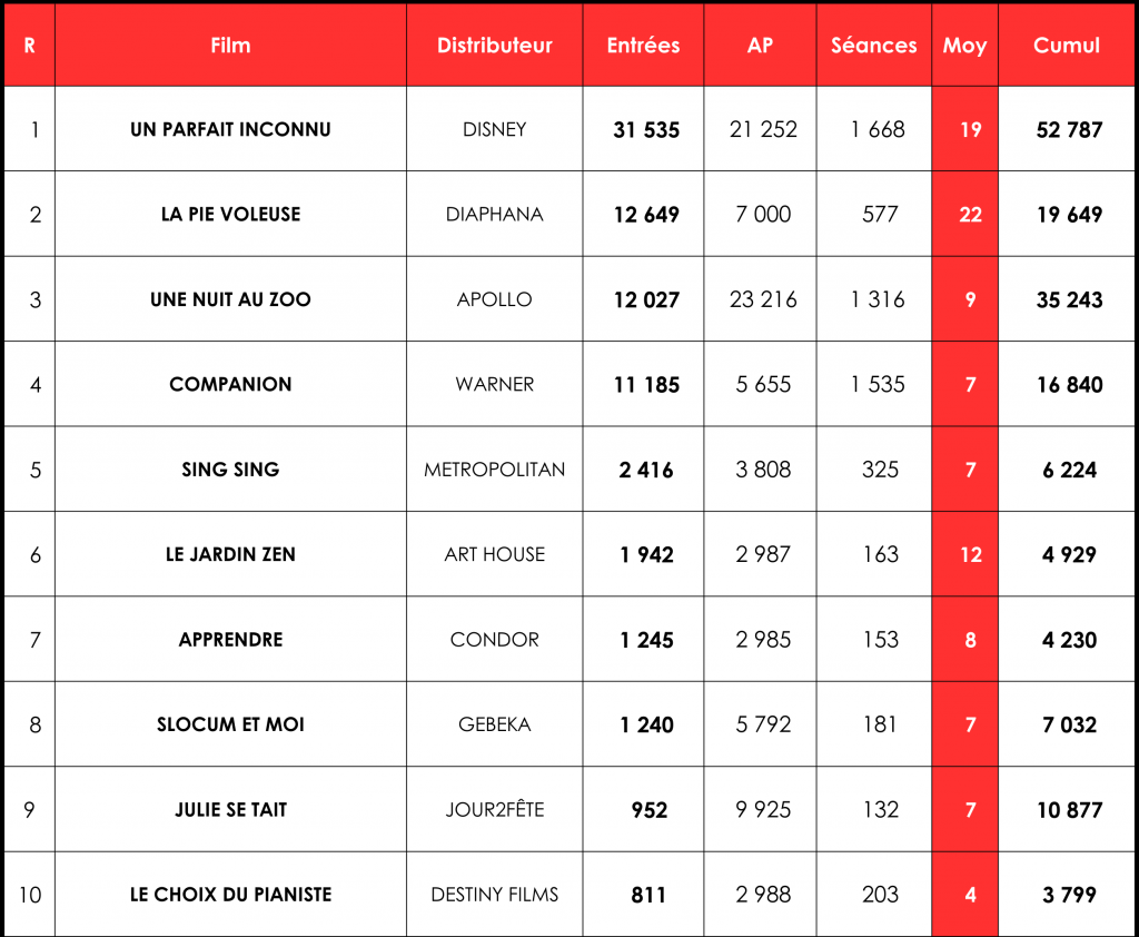 31 500 tickets, soit 19 entrées par séances (e/s) pour Un parfait inconnu. S’il se place en-deçà du biopic sur le « King » Elvis, qui avait attiré 23 spectateurs par séance (et 42 700 spectateurs) en juin 2022, il égale Rocketman et ses 19 e/s pour 34 700 entrées fin mai 2019. En ajoutant les chiffres de sa campagne d’avant-premières (AP), le biopic atteint près de 53 000 entrées.