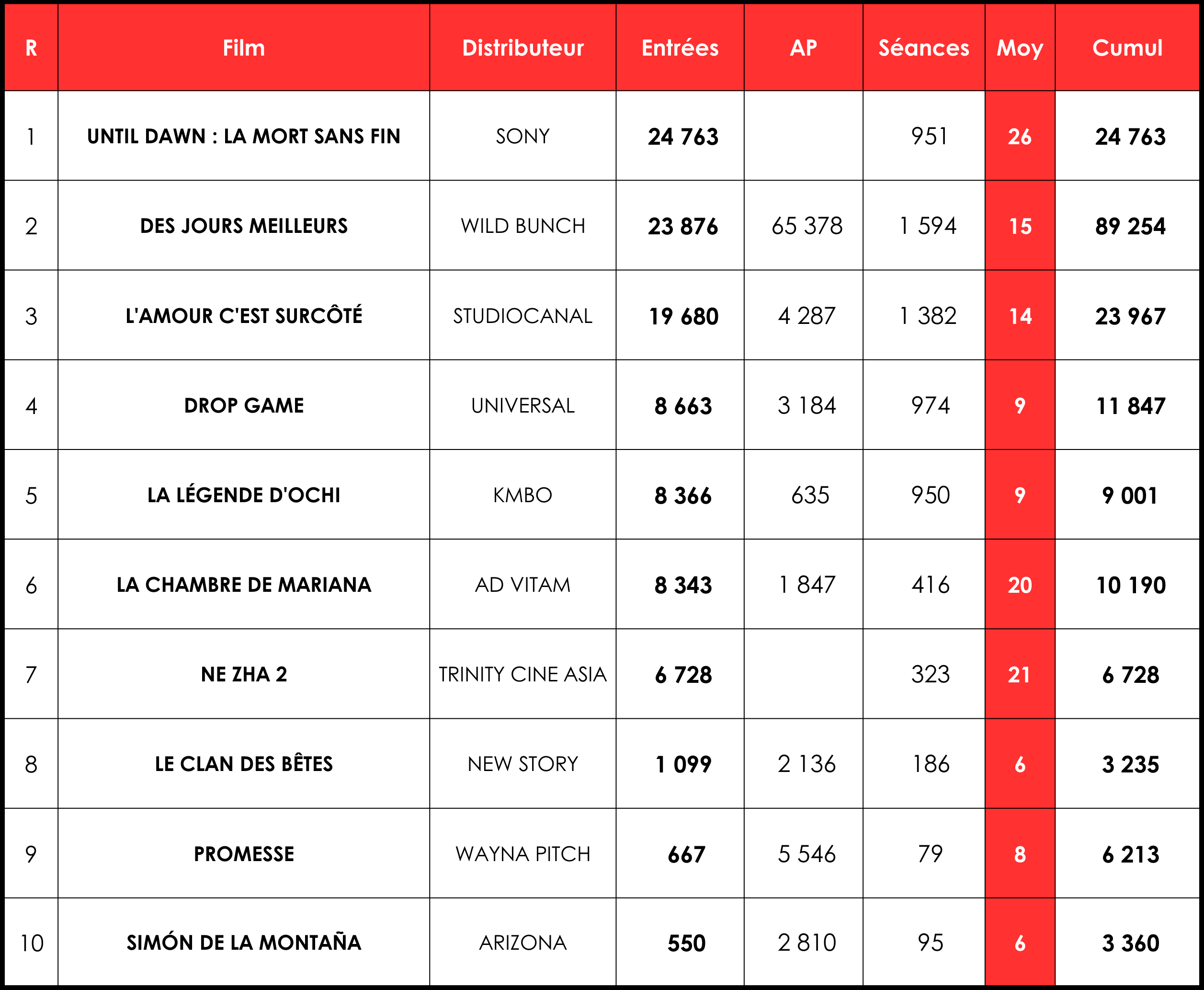 Until Dawn : la mort sans fin effraie 25 000 spectateurs, pour une moyenne de 26 entrées par séance (e/s). Le réalisateur David F. Sandberg d’Anabelle 2 (100 000 entrées avec AP en août 2017) et de Dans le noir (50 000 entrées en août 2016) réalise un démarrage davantage comparable à un Nightmare Island (20 000 entrées pour 20 e/s en février 2020, pour un cumul final à 370 000 tickets), également distribué par Sony, qui suivait un groupe d’amis piégé, non pas dans le temps mais sur une île, ou d’un Evil Dead Rise (26 000 entrées pour 24 e/s en avril 2023, cumul à 600 000).
