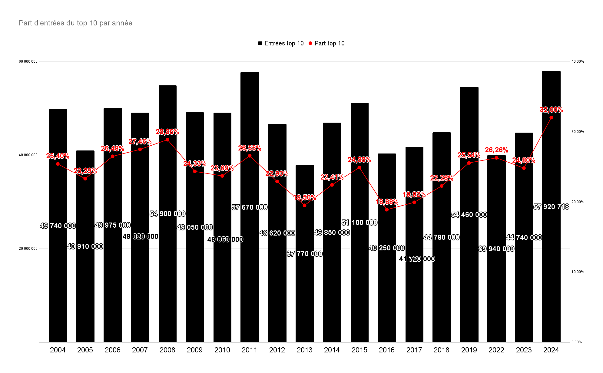 Bien que 2024 ait dépassé les attentes, les plaies dues à la pandémie ne sont pas encore totalement guéries. La grande exploitation accuse toujours un retard important par rapport à 2017-2019, et les distributeurs indépendants alertent sur une concentration de plus en plus importante au détriment de la diversité. En effet, depuis plus de 20 ans, le top 10 annuel n’avait jamais cumulé autant d’entrées (57,9 M) et concentré une aussi grande part au sein de la fréquentation globale (32 %). Le caractère atypique de cette année se traduit ainsi par une succession de records qui sont venus contrebalancer un début d’exercice titubant.