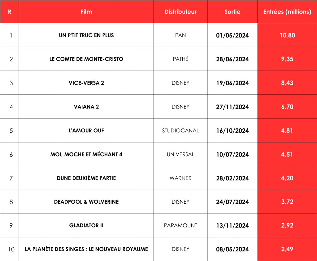 À l’échelle de 2024, Un p’tit truc en plus termine à la première place du box-office national avec 10,8 M d’entrées, soit le plus haut résultat pour une œuvre française depuis les 12,3 M de Qu’est-ce qu’on a fait au bon Dieu ?, en 2014. Le Comte de Monte-Cristo arrive à la deuxième place avec 9,3 M de tickets, et Vice-versa 2 clôture le podium avec 8,4 M de billets. Au total, trois films français intègrent le top 5 annuel – ce qui n’avait pas été vu depuis 2018 – et cumulent 24 M de tickets ; une performance inédite depuis 2011 où Intouchables et Rien à déclarer totalisaient à eux-deux 24,9 M d’entrées.