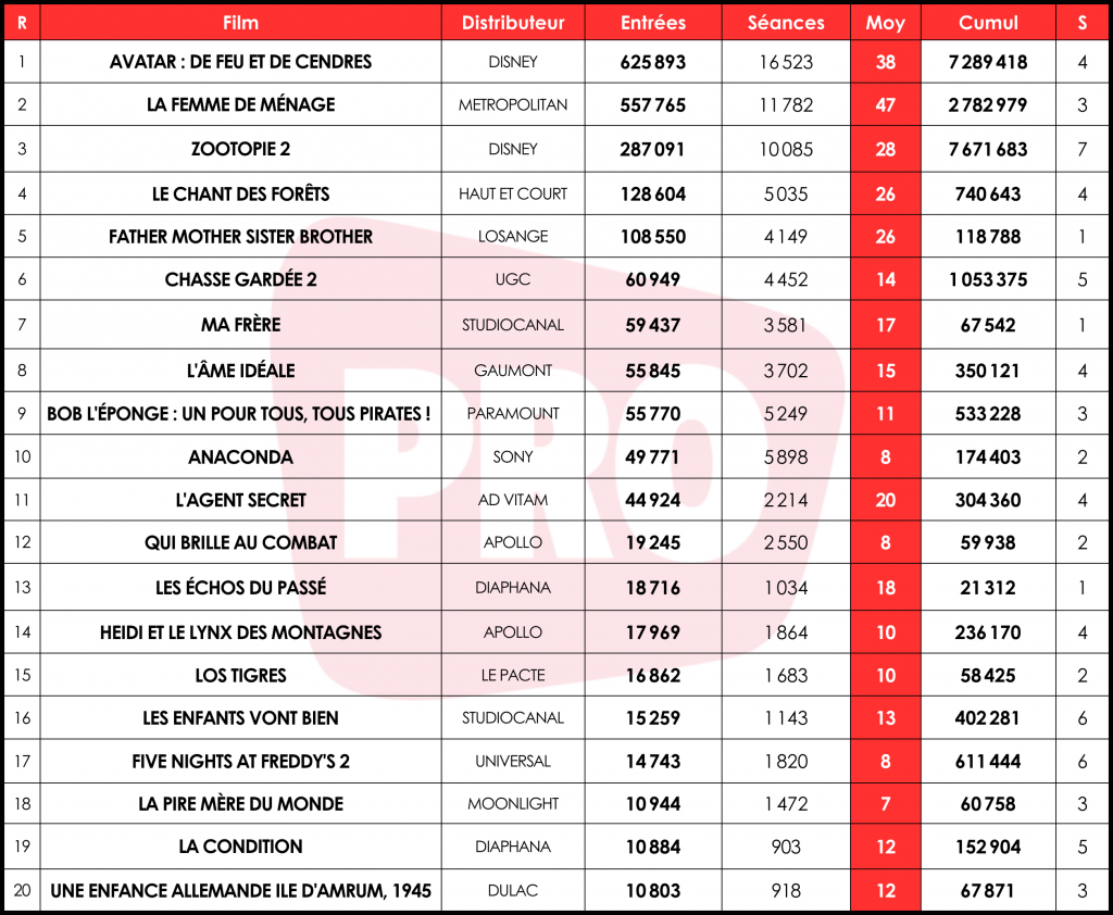 Lourde chute pour Avatar : De feu et de cendres qui enregistre 625 000 entrées (-57 %). Il s’agit d’un recul plus important que les -42 % qu’affichait le second volet au quatrième week-end, écoulant alors 1,4 million (M) de tickets pour un cumul de 10,1 M. La voie des 10 M semble se rétrécir de plus en plus pour ce troisième Avatar, qui totalise près de 7,3 M d’entrées. Du côté des autres grosses sorties de fin d’année en chute post-rentrée, De feu et de cendres devance les 463 000 entrées de Spider-Man : No Way Home et les 355 000 de Mufasa : Le Roi Lion. Disney voit un autre de ses titres enregistrer un lourd recul : Zootopie 2, avec 287 000 spectateurs (-63 %). Une baisse logique pour le film jeune public, semblable à ce qu’a connu Vaiana 2 (143 000 entrées, -73 %) ou Sonic 3 (197 000 entrées, -69 %) l’année dernière. Mais le deuxième volet des aventures de Judy et Nick totalise près de 7,7 M d’entrées, et devient le sixième plus grand succès post-Covid, devant les près de 7,4 M de Super Mario Bros.