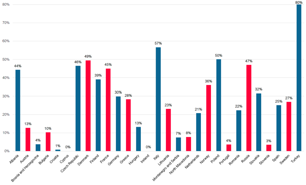 Estimations préliminaires basées sur le box-office, à l’exception de la France où elles sont basées sur les entrées. Les chiffres pour le Monténégro et la Serbie sont rassemblés en raison des pratiques industrielles locales. Les chiffres italiens représentent 95 % du marché (données Cinetel). ©UNIC