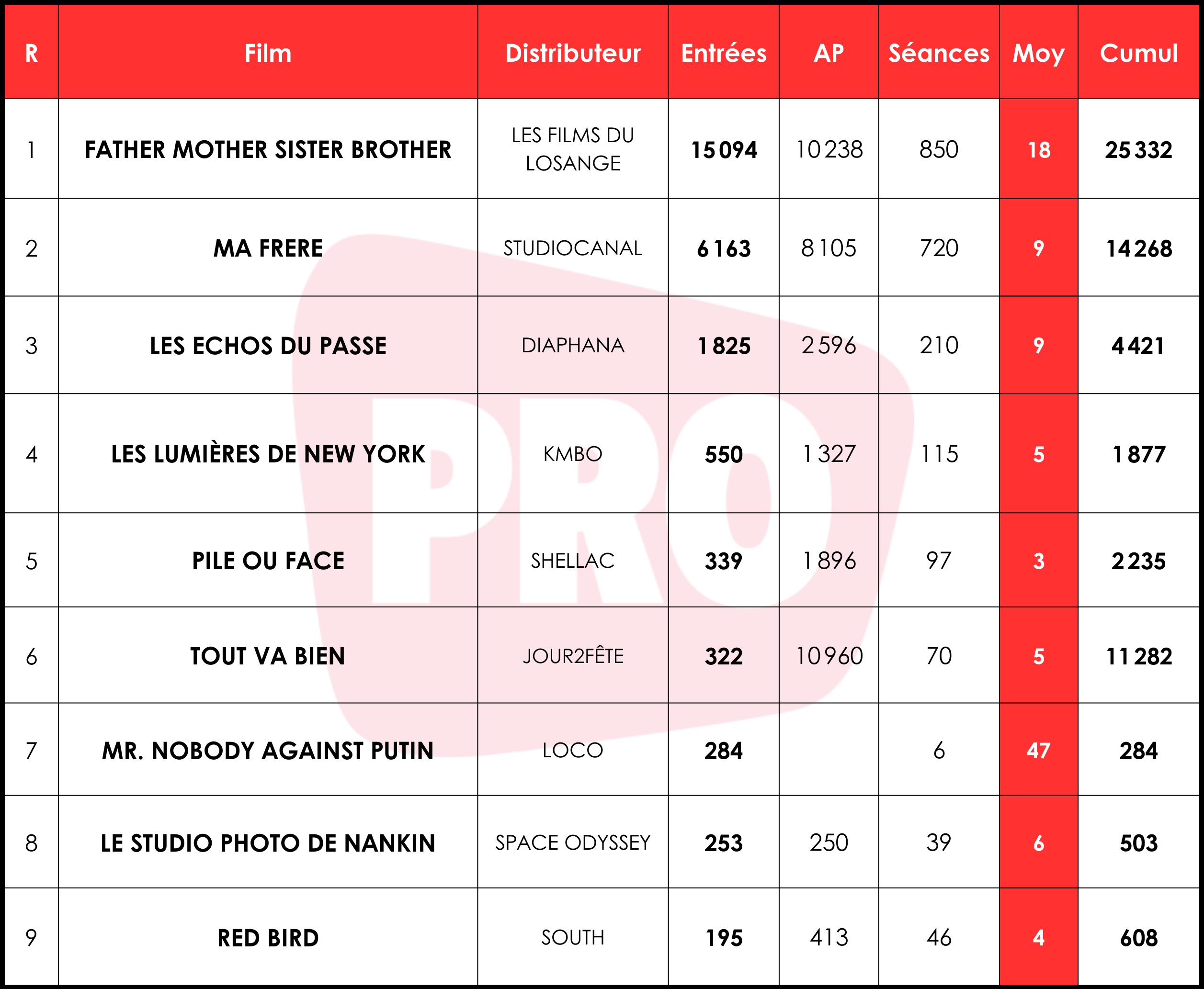 15 000 cinéphiles ont découvert Father Mother Sister Brother hier, soit une moyenne de 18 entrées par séance (e/s) ; avec les avant-premières (AP), le total grimpe à 25 000 billets. Le Lion d’or de la dernière Mostra de Venise offre à son distributeur Les Films du Losange son meilleur démarrage depuis… Amour de Michael Haneke en 2012. Dans le registre familial, Armageddon Time de James Gray écoulait 13 500 tickets (14 e/s, et 17 000 avec AP) pour un cumul d’environ 400 000 entrées, tandis que Valeur sentimentale attirait 22 000 curieux (30 e/s, 34 000 billets avec AP) pour terminer autour des 425 000 entrées.