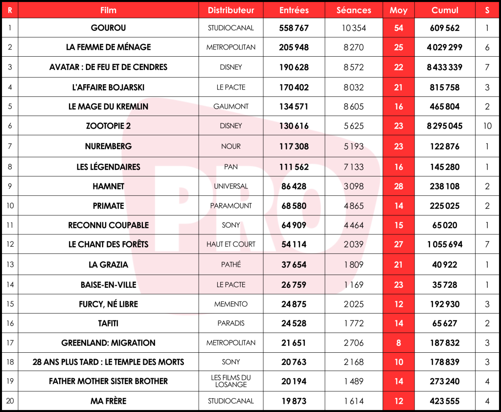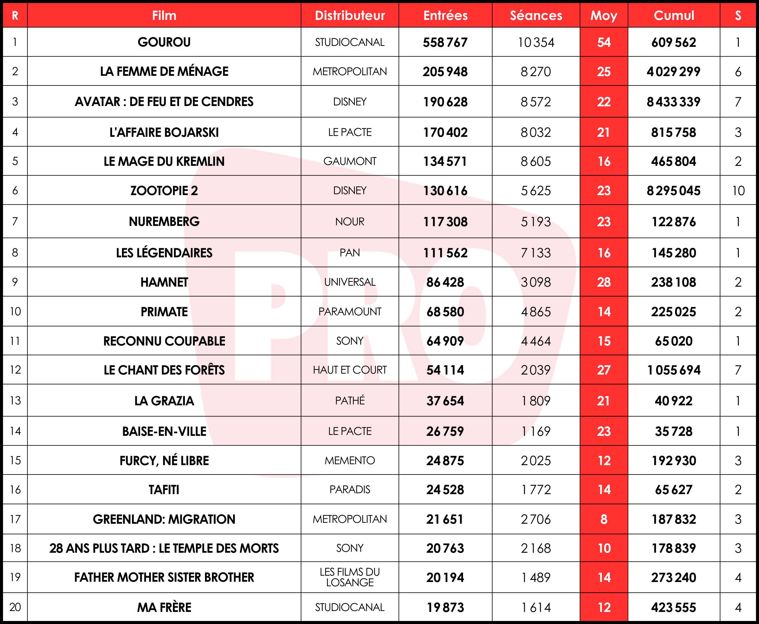 Fort démarrage pour Gourou qui réalise 558 000 entrées, pour un cumul à 609 000 avec les avant-premières. Le long métrage de Yann Gozlan obtient une très bonne moyenne de 54 entrées par séance (e/s), soit la meilleure pour un film français depuis février 2025 et God Save the Tuche. Il s’agit en outre de la septième meilleure performance à la séance pour une production tricolore depuis 2021. Gourou dépasse ainsi largement ses principaux comparables comme Kompromat (164 000 entrées pour 18 e/s, cumul à 604 000), Goliath (204 000 entrées pour 23 e/s, cumul à 790 000) ou Boîte noire (224 000 entrées pour 26 e/s, cumul à 1,2 million). Il se retrouve dans la danse avec L’Amour ouf, qui avait connu un meilleur week-end d’ouverture (676 000 entrées pour 65 e/s), et une fin de carrière à plus de 4,9 millions (M) de tickets. Mais avec l’arrivée des vacances d’hiver, rien ne semble interdit au Gourou…