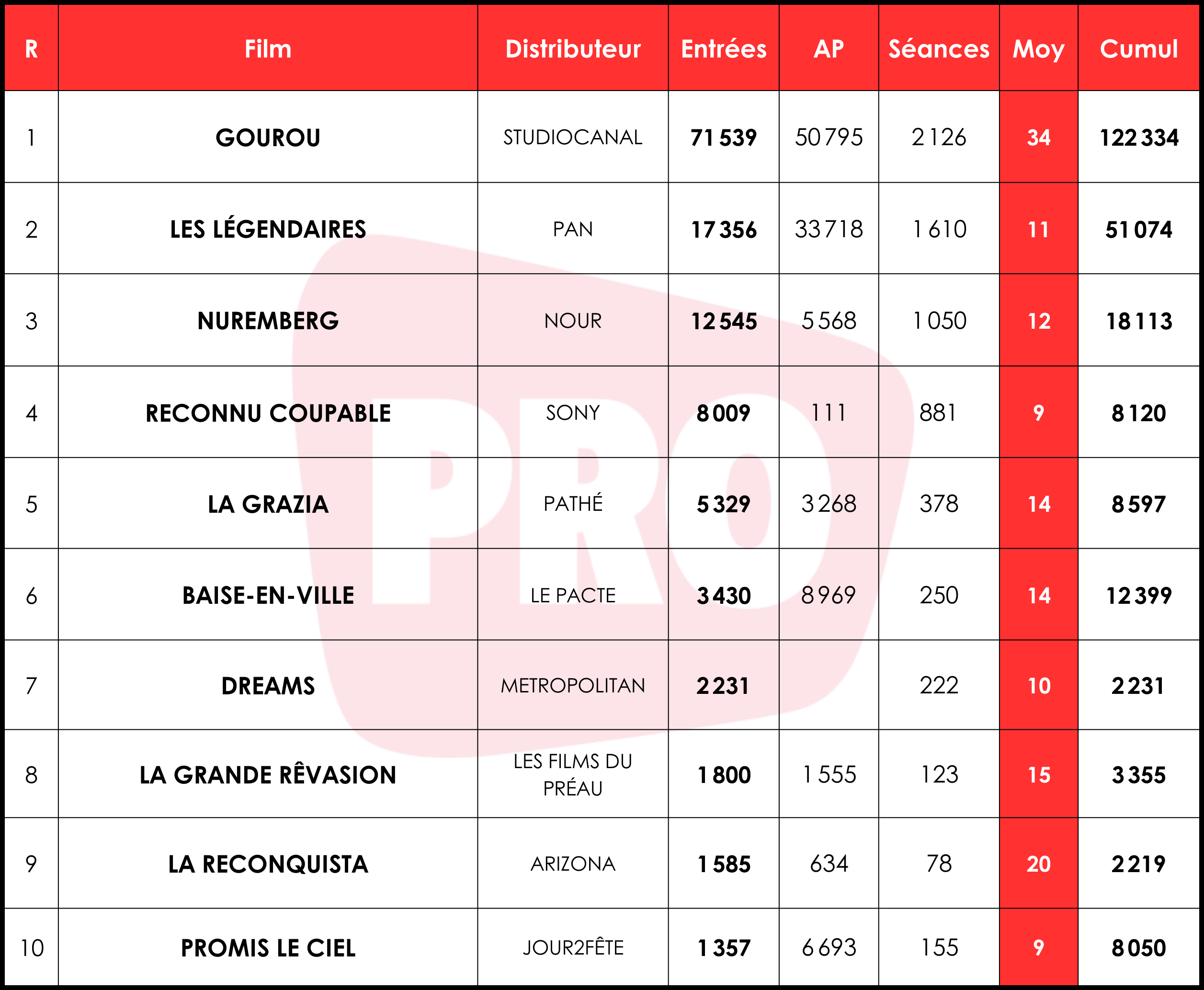 Plus grande sortie de Nour, Nuremberg appelle à la barre 12 500 spectateurs (18 100 avec AP) pour 12 e/s. Il s’agit du meilleur démarrage de l’histoire du distributeur, qui a pour rappel connu une année 2025 historique, grâce notamment aux succès de Life of Chuck (300 000 entrées) et de La Réparation (200 000). Également sur la Seconde Guerre mondiale, La Ruse se lançait quant à lui à 17 600 tickets pour 13 e/s (cumul à 295 000).