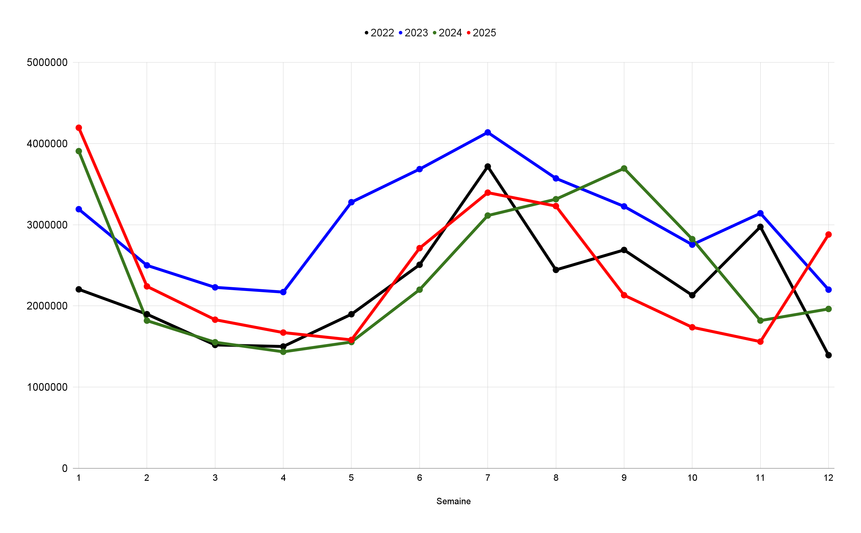 Au total, le top 20 réalise près de 2,9 millions d’entrées, soit une hausse de 84 % par rapport à la semaine dernière, de 46 % par rapport à la même semaine de 2024, et de 30 % par rapport à celle de 2023.