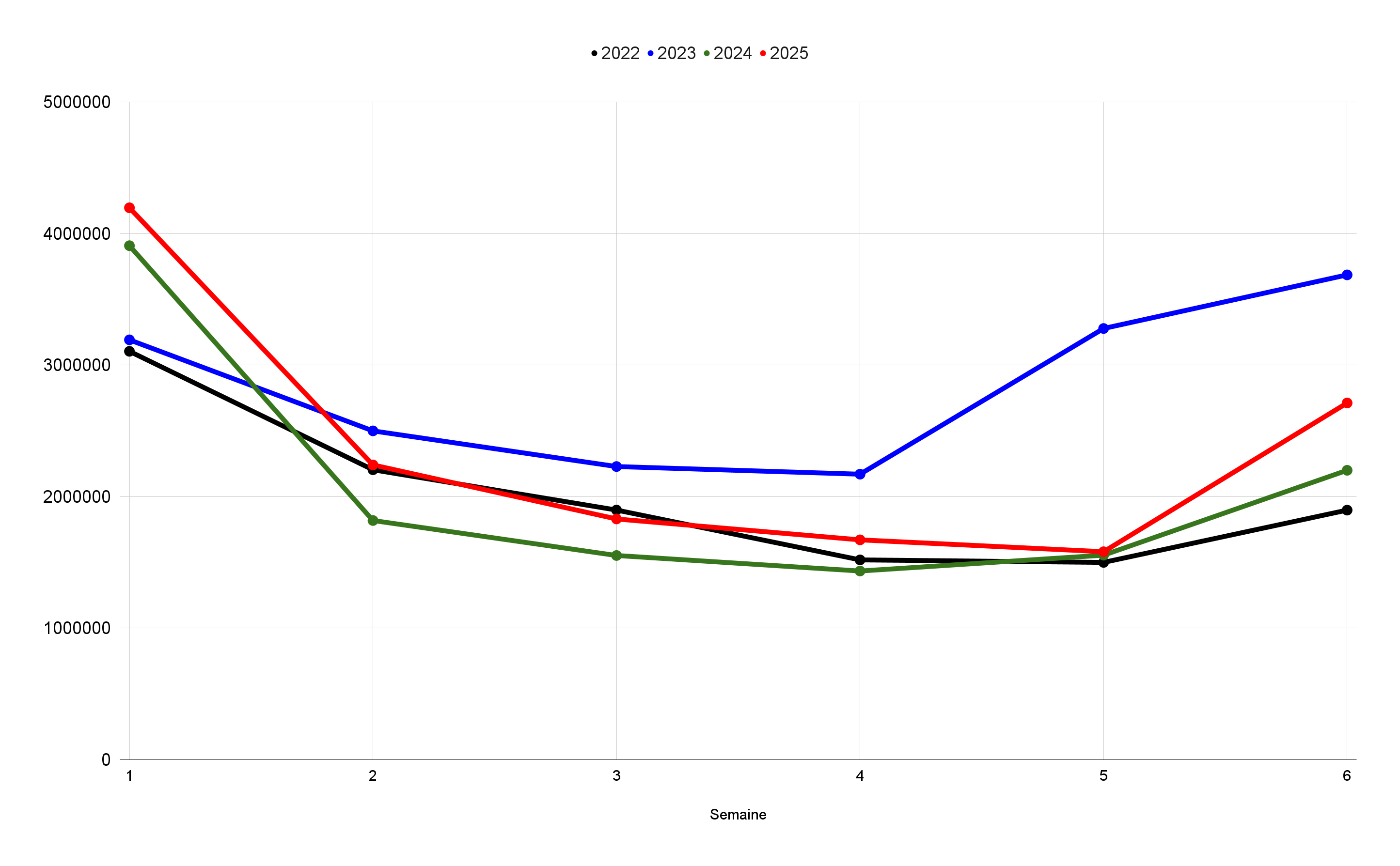 Il faut toutefois noter que cette moyenne 2022-2024, était principalement portée par les 3,6 M enregistrés en 2023 : le classement de l’époque était, entre autres, composé d’Alibi.com 2 et Astérix et Obélix : L’Empire du milieu (1 M d’entrées chacun), Avatar : La Voie de l’eau (298 000 entrées) ou encore Titanic en ressortie (242 000).