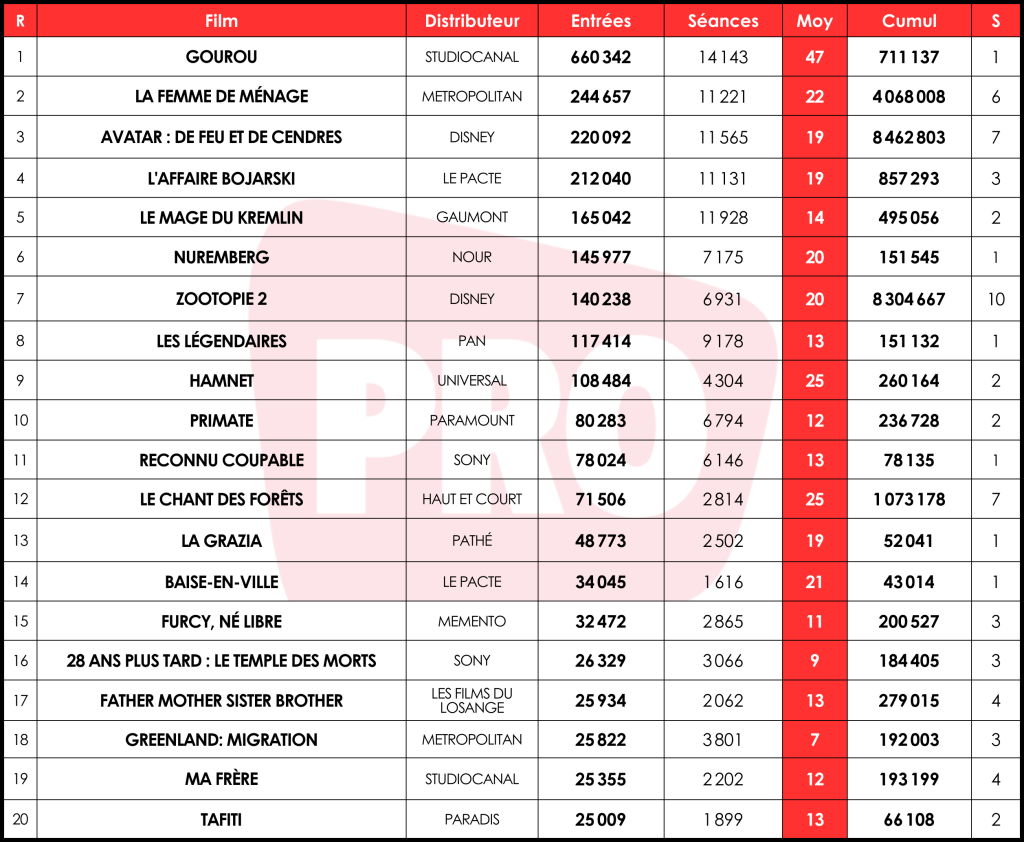 La Femme de ménage continue de surfer sur sa vague avec 244 000 entrées en sixième semaine, pour un cumul à plus de 4 M. Sept semaines après sa sortie, Avatar : De feu et de cendres continue aussi de briller, et attire 220 000 spectateurs pour un total à 8,4 M. Il s’agit, depuis 2021, de la douzième meilleure septième semaine, entre les 245 000 entrées de Super Mario Bros. et les 201 000 entrées de Simone, le voyage du siècle. Chez Le Pacte, L’Affaire Bojarski ne recule que de 21 % et n’est plus qu’à 150 000 spectateurs du million d’entrées. Le Mage du Kremlin connaît quant à lui une deuxième semaine plus contrastée : le thriller politique d’Olivier Assayas baisse de 45 %, mais écoule toujours 165 000 tickets, pour un total de 495 000 entrées. Il devrait devenir dans les prochains jours le plus grand succès du réalisateur, devant les plus de 530 000 billets des Destinées sentimentales, en 2000.