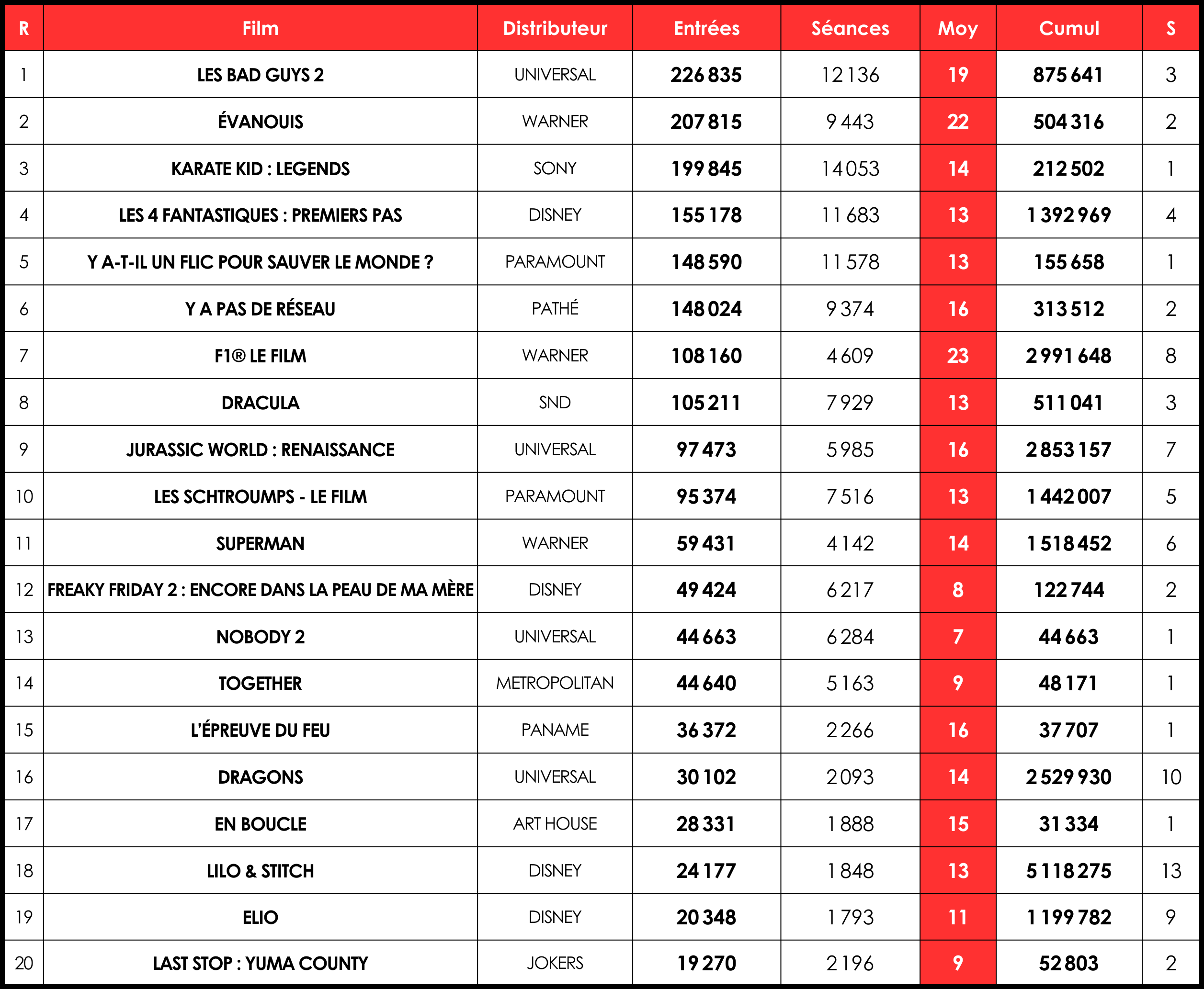 Les continuations enregistrent une baisse de 24 % en moyenne, avec quelques bons maintiens comme Les Bad Guys 2 (226 000 entrées, -7 %) qui cumule 875 000 tickets, au rythme de 19 e/s. F1 affiche également une belle tenue (108 000 entrées, -10 %), et réalise la meilleure performance à la séance du top 20, avec 23 e/s. Le film de Joseph Kosinski n’est plus qu’à 10 000 billets des 3 millions d’entrées, et deviendra bientôt le troisième film de 2025 à atteindre ce cap. Évanouis poursuit sa lancée avec 207 000 nouvelles entrées (-26 %), et une moyenne de 22 e/s, la deuxième meilleure du classement. Avec 504 000 tickets, il devient le troisième meilleur succès d’horreur de l’année, juste derrière les 532 000 de 28 ans plus tard.