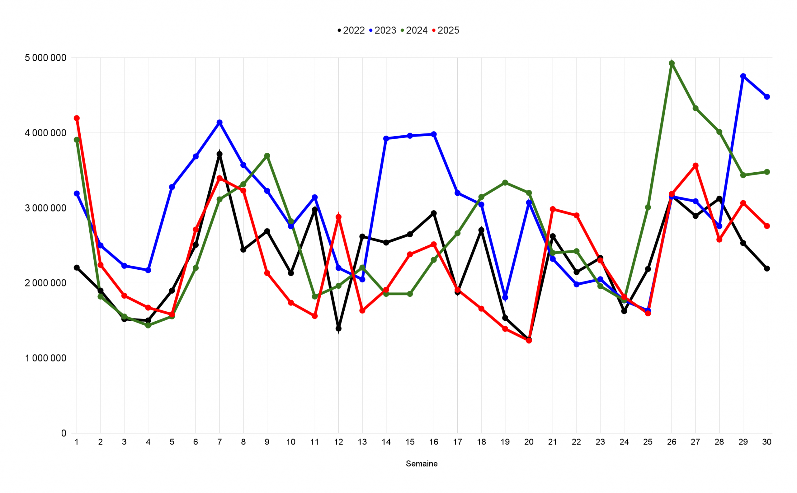 Entrées du top hebdomadaire (2022-2025) :