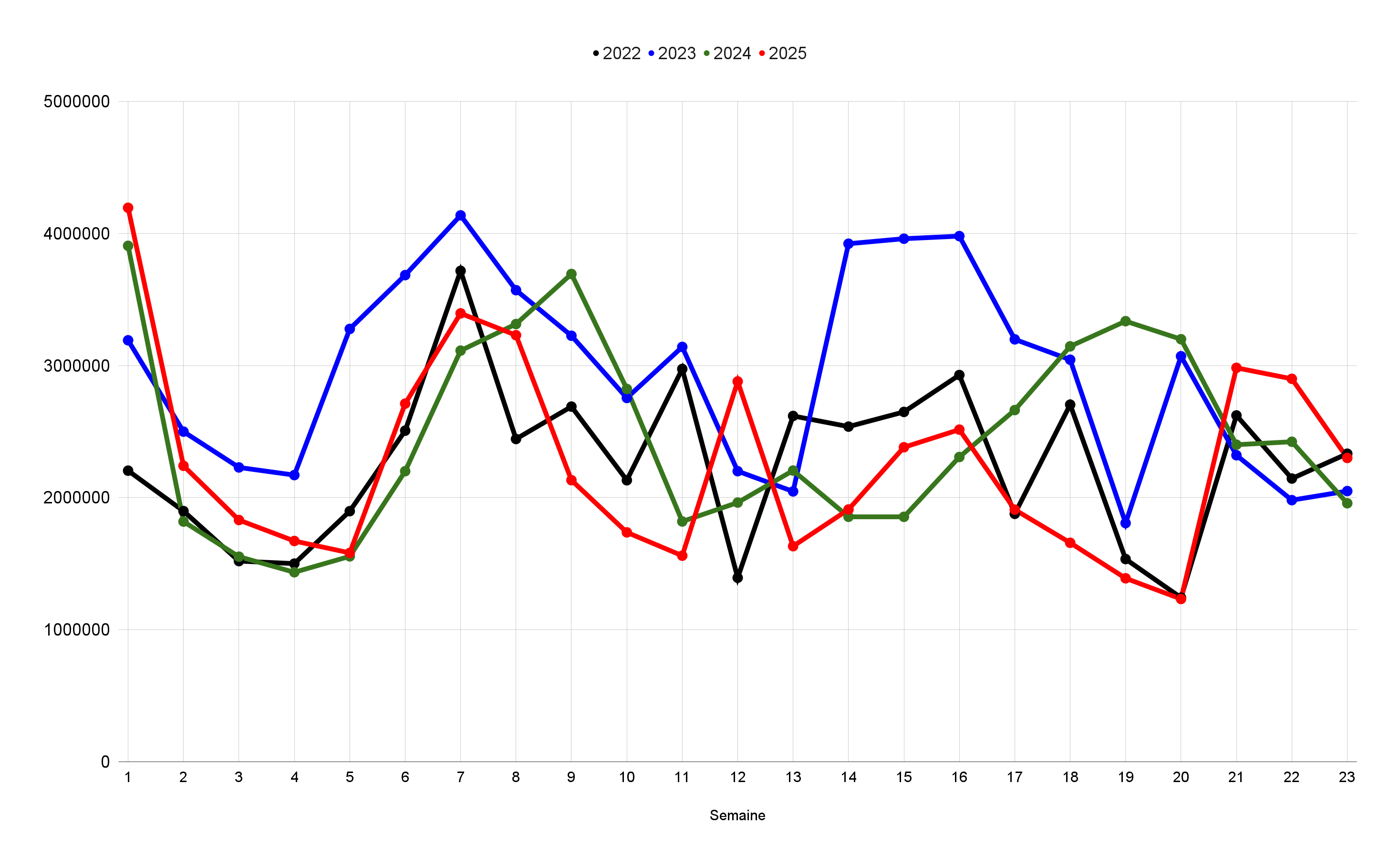 Au total, le classement hebdomadaire engrange 2,3 M entrées, soit une légère baisse de 21 % par rapport à la semaine dernière. Le top 20 demeure ainsi au-dessus des résultats de la semaine équivalente en 2024 (+17,5 %) et 2023 (+12,3 %). Depuis le début de l’année, les tops 20 hebdomadaires cumulent 52 M d’entrées, à hauteur de l’année 2022, en retrait de 23 % par rapport à 2023, et de 4,5 % par rapport à 2024 (56,5 M).