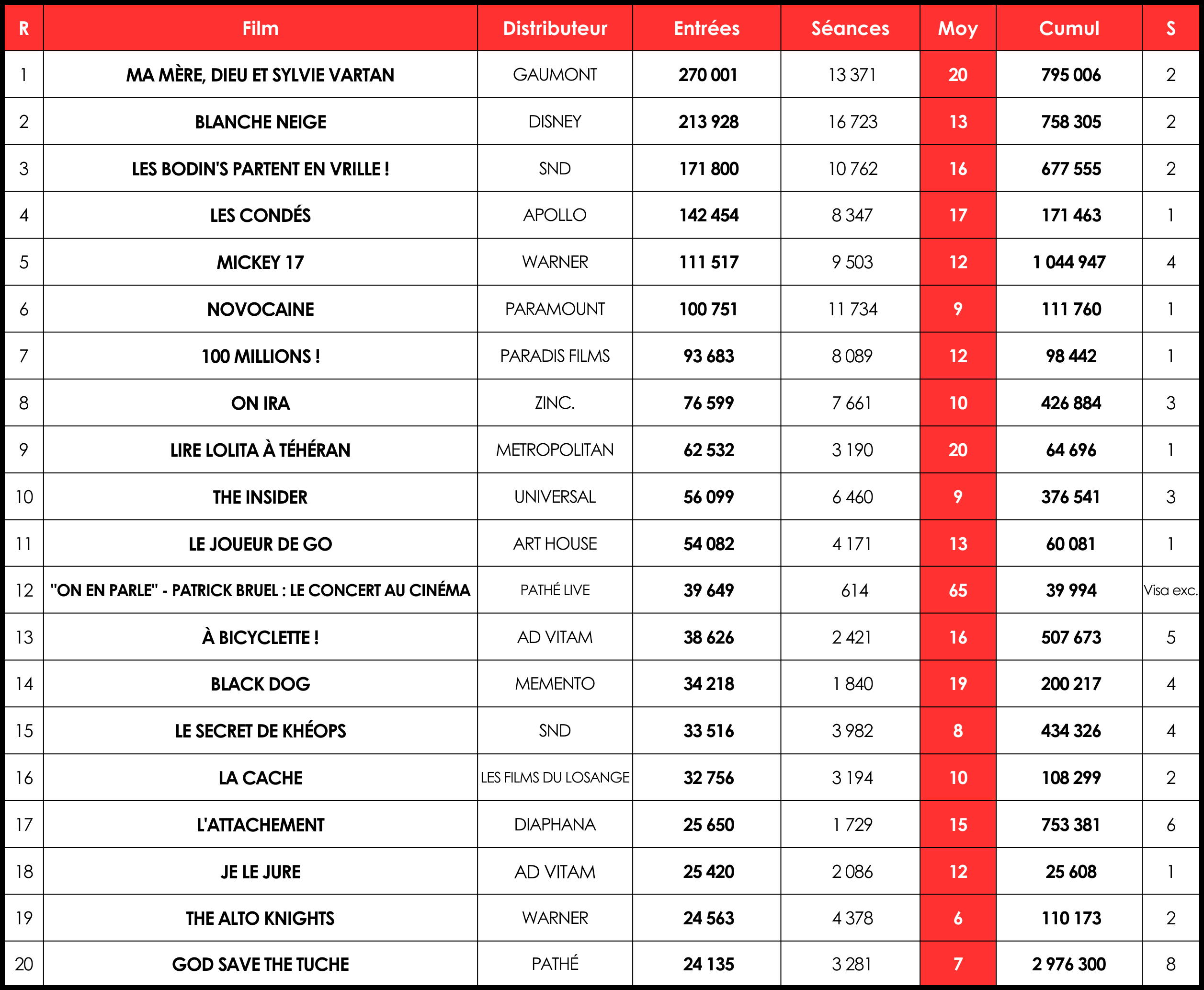 Ma mère, Dieu et Sylvie Vartan prend le trône à Blanche Neige avec 270 000 spectateurs et une moyenne de 20 entrées par séance (e/s). Le film de Ken Scott totalise 795 000 tickets, et devance les 716 000 engrangés au même stade par Un ours dans le Jura, également sorti par Gaumont (cumul à 1,4 million). De son côté, la princesse Disney tient mal le cap de la deuxième semaine avec une chute de 61 %, et un cumul à 758 000, derrière les 919 000 au même stade de La Petite Sirène en 2023 (cumul à 1,8 million).