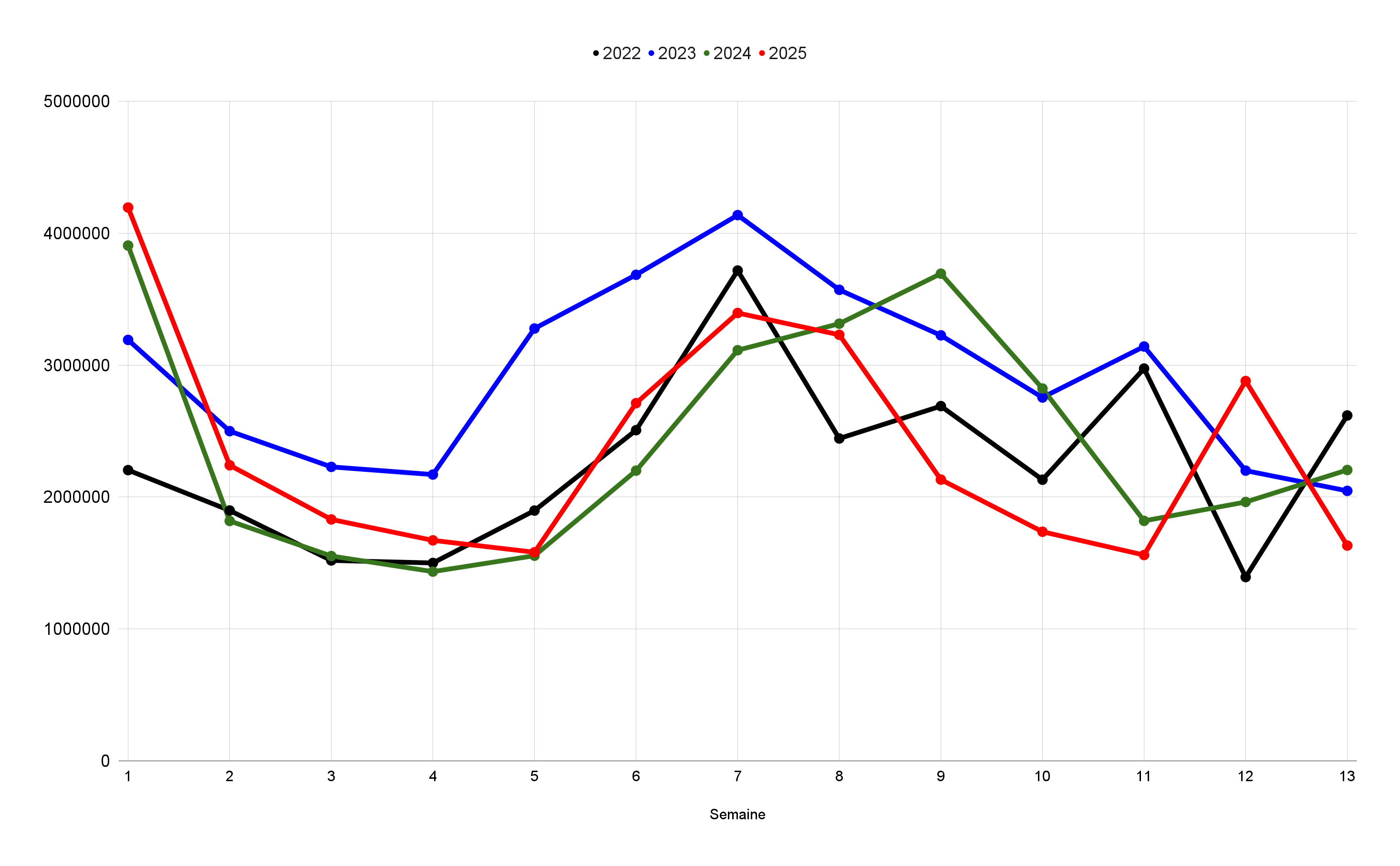 Au total, le top 20 de la semaine représente 1,6 million (M) d’entrées, soit une baisse de 43 % par rapport à la semaine dernière, de 26 % par rapport à la même semaine de 2024 et de 20 % par rapport à 2023. Le cumul du top 20 des 13 premières semaines de 2025 est de 30,8 M d’entrées, contre 31,4 M pour 2024, et 38,1 M pour 2023.