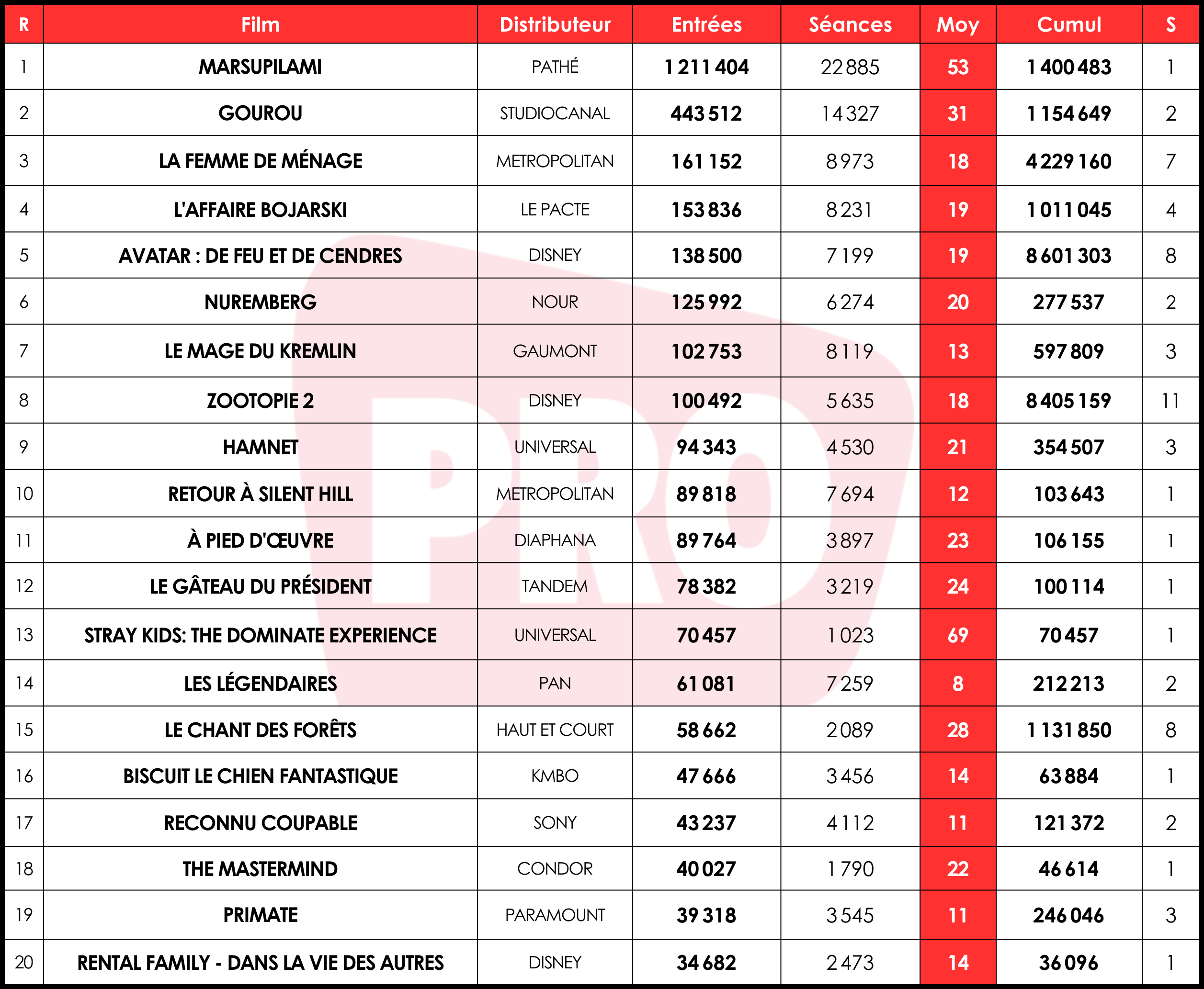 Les nouveautés affichent globalement des résultats contrastés. Chez Metropolitan, Retour à Silent Hill affiche 89 000 pour 12 e/s, là où 28 ans plus tard : Le Temple des morts a bouclé sa première semaine à 103 000 spectateurs pour 14 e/s. Démarrage également poussif pour Rental Family – Dans la vie des autres (34 000 entrées pour 14 e/s) et Biscuit le chien fantastique (47 000 entrées pour 14 e/s), mais ce dernier peut, comme l’espère son distributeur KMBO, tenir tout au long des vacances d’hiver. Diaphana, Tandem et Condor ont pour leur part connu une riche semaine avec leurs sorties respectives À pied d’œuvre (89 000 entrées pour 23 e/s), Le Gâteau du Président (78 000 entrées pour 24 e/s) et The Mastermind (40 000 entrées pour 22 e/s). Mentionnons également le cas de Stray Kids: The dominATE Experience, diffusé sur 1 000 séances et qui a obtenu une excellente moyenne de 69 e/s, la meilleure de 2026. Au total, les huit nouveautés du top 20 engrangent 1,6 M d’entrées, soit environ 52 % de la fréquentation totale du classement.