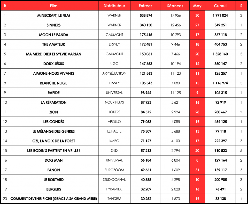 Belle domination de Warner dans ce top 20 hebdomadaire avec Minecraft, le film et Sinners, qui enregistrent respectivement 538 000 et 340 000 tickets. Ce dernier obtient également une belle moyenne de 27 entrées par séance (e/s), la quatrième meilleure du classement ; Minecraft réalise quant à lui – sur sa troisième semaine – la deuxième meilleure performance avec 30 e/s.