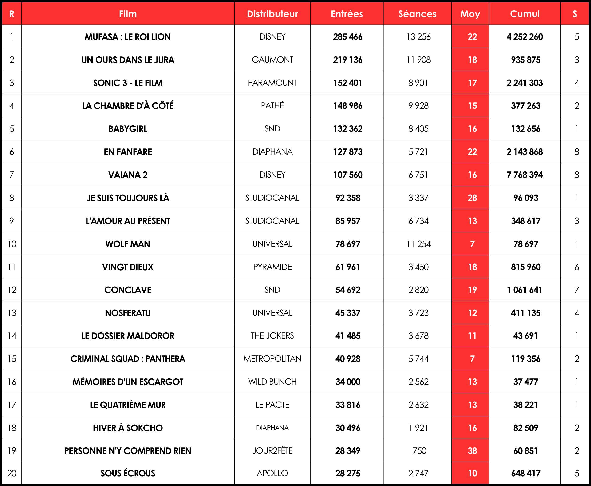 Les six nouveautés du classement peinent à bousculer la hiérarchie, et compilent 412 000 billets pour près de 32 000 séances, soit une part de marché de respectivement 22 % et 27 %. Babygirl se place à la cinquième place avec 132 000 tickets et 16 entrées par séance (e/s), tandis que Je suis toujours là convainc le plus les spectateurs, avec 92 000 entrées pour 28 e/s ; la meilleure moyenne parmi les nouveautés. Du côté des autres sorties, Wolf Man peine à émerger avec ses 7 e/s, à l’instar du Dossier Maldoror de Fabrice Du Welz (11 e/s), de Mémoires d’un escargot d’Adam Elliot et du Quatrième mur de David Oelhoffen (13 e/s tous deux).