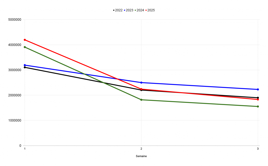 Le top 20 hebdomadaire réalise 1,83 million (M) d’entrées, et baisse de 18 % par rapport à la semaine dernière ; un recul habituel en troisième semaine de janvier, bien que plus important que ces trois dernières années, où il s’établissait en moyenne à -13 %. Également, par rapport à la moyenne 2022-2024 de 1,87 M entrées hebdomadaires, cette troisième semaine de janvier est en retrait de 2,5 %.