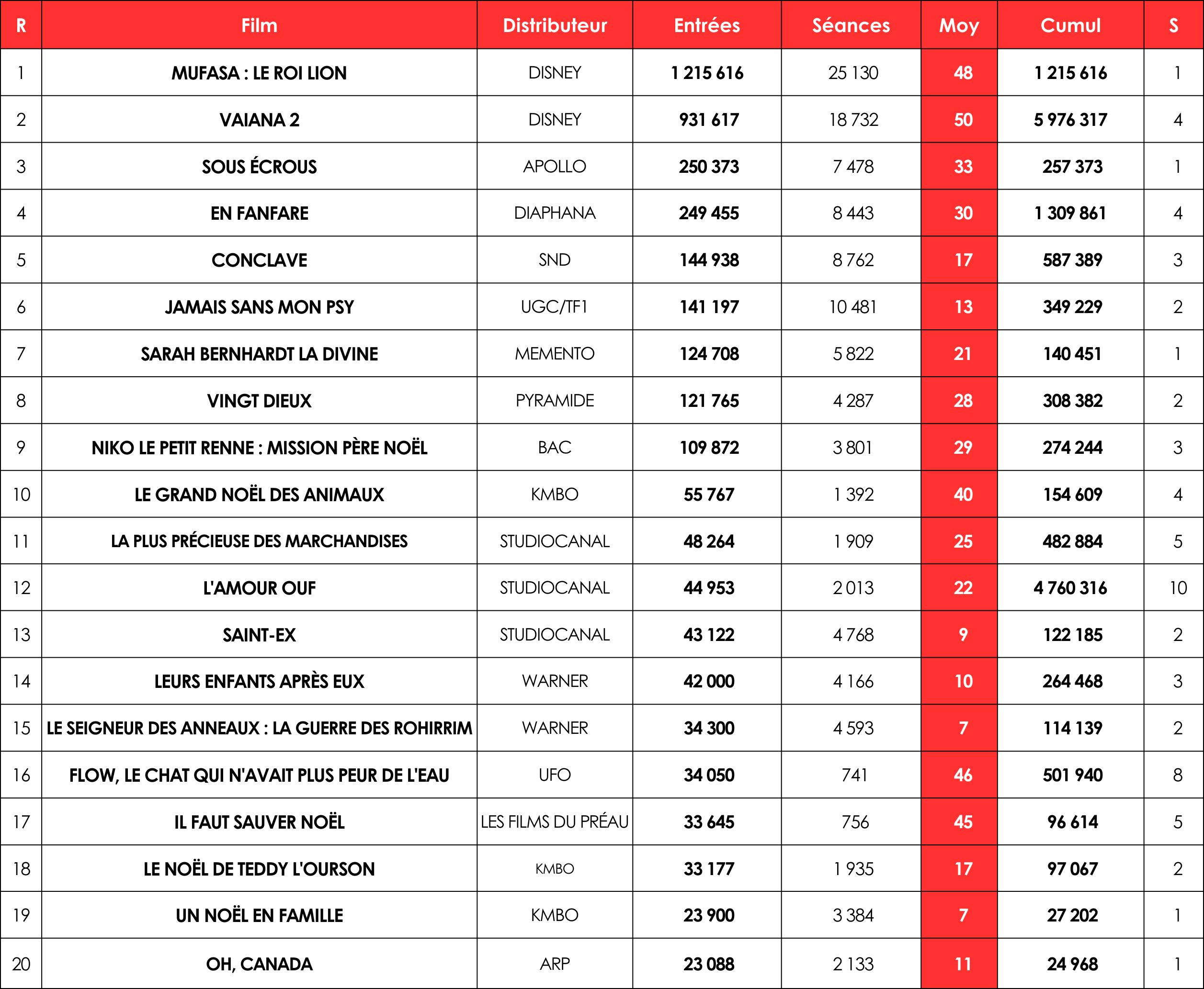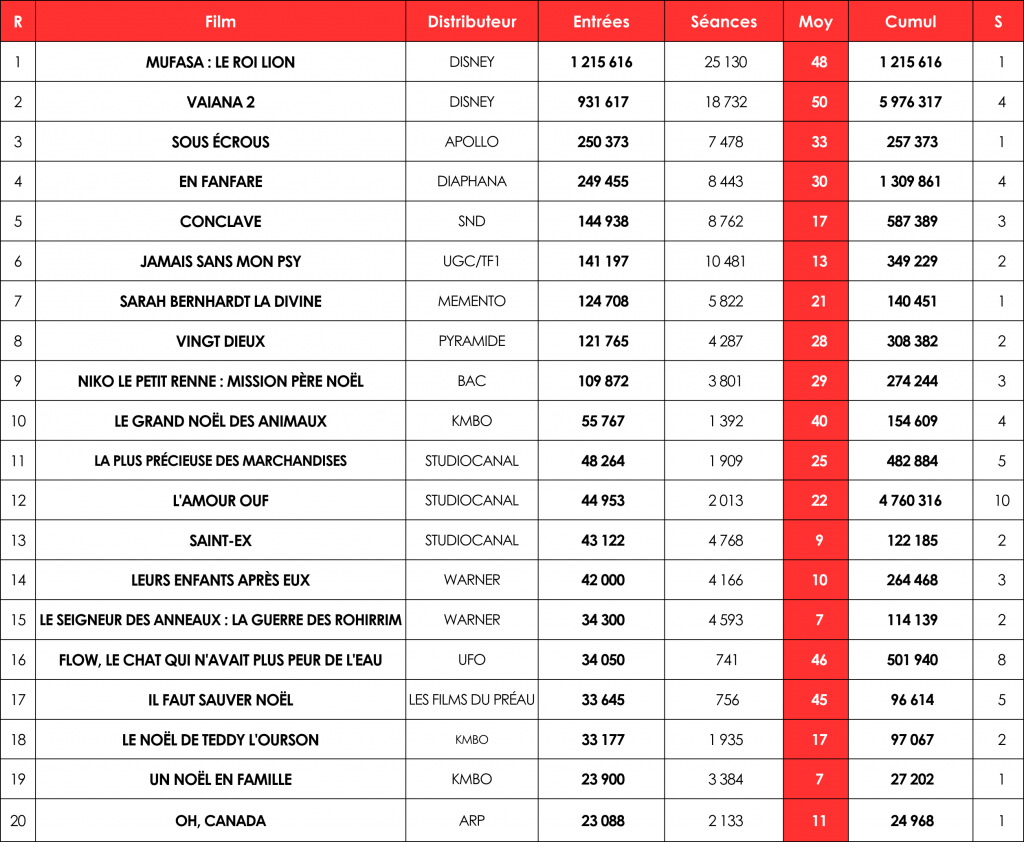 Avec 3,7 millions (M) d’entrées enregistrées – sans compter les entrées non communiquées de Kraven the Hunter, Wicked ou Gladiator II qui atteignaient tous trois 300 000 tickets au dimanche soir –, le classement hebdomadaire réalise une belle hausse de 33 % par rapport à la semaine dernière, et de 18 % par rapport à la même période de l’année dernière. Mufasa : Le Roi Lion domine logiquement les débats avec 1,2 M d’entrées, soit la quatrième meilleure première semaine de l’année. Avec en plus Vaiana 2, Disney s’impose dans ce classement avec une part de marché 58 %.