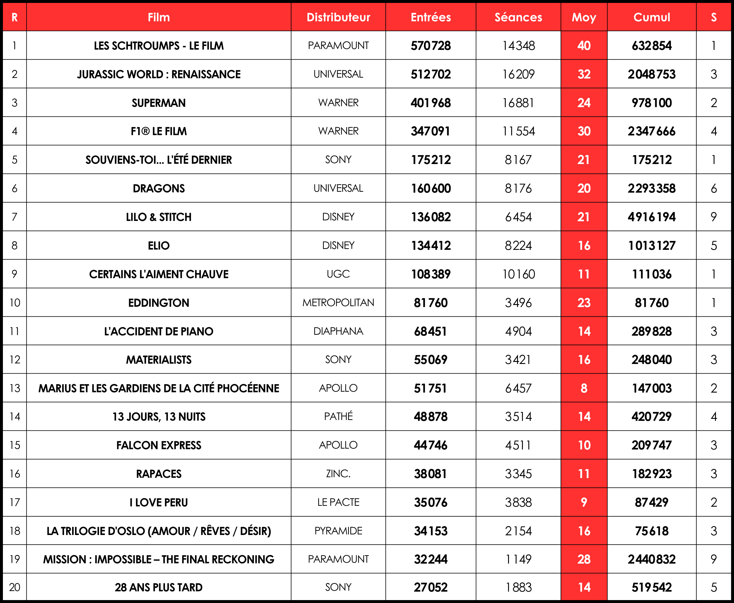 Les continuations affichent de bonnes tenues avec une baisse moyenne de 12 %, F1 restant stable avec ses 347 000 séances. Belle performance également pour les films jeune public tels que Lilo & Stitch (136 000 entrées, -6 %), Elio (134 000 entrées, -7 %), Falcon Express (44 000 entrées, -9 %) et Dragons (160 000 entrées, -15 %), ainsi que pour Mission: Impossible – The Final Reckoning qui obtient la quatrième meilleure moyenne du classement avec 28 e/s. Notons aussi les 34 000 entrées de La Trilogie d’Oslo qui cumule les performances de Amour, Rêves et Désir, ce dernier étant dans sa première semaine (rappel de la sortie en trois parties de Pyramide).