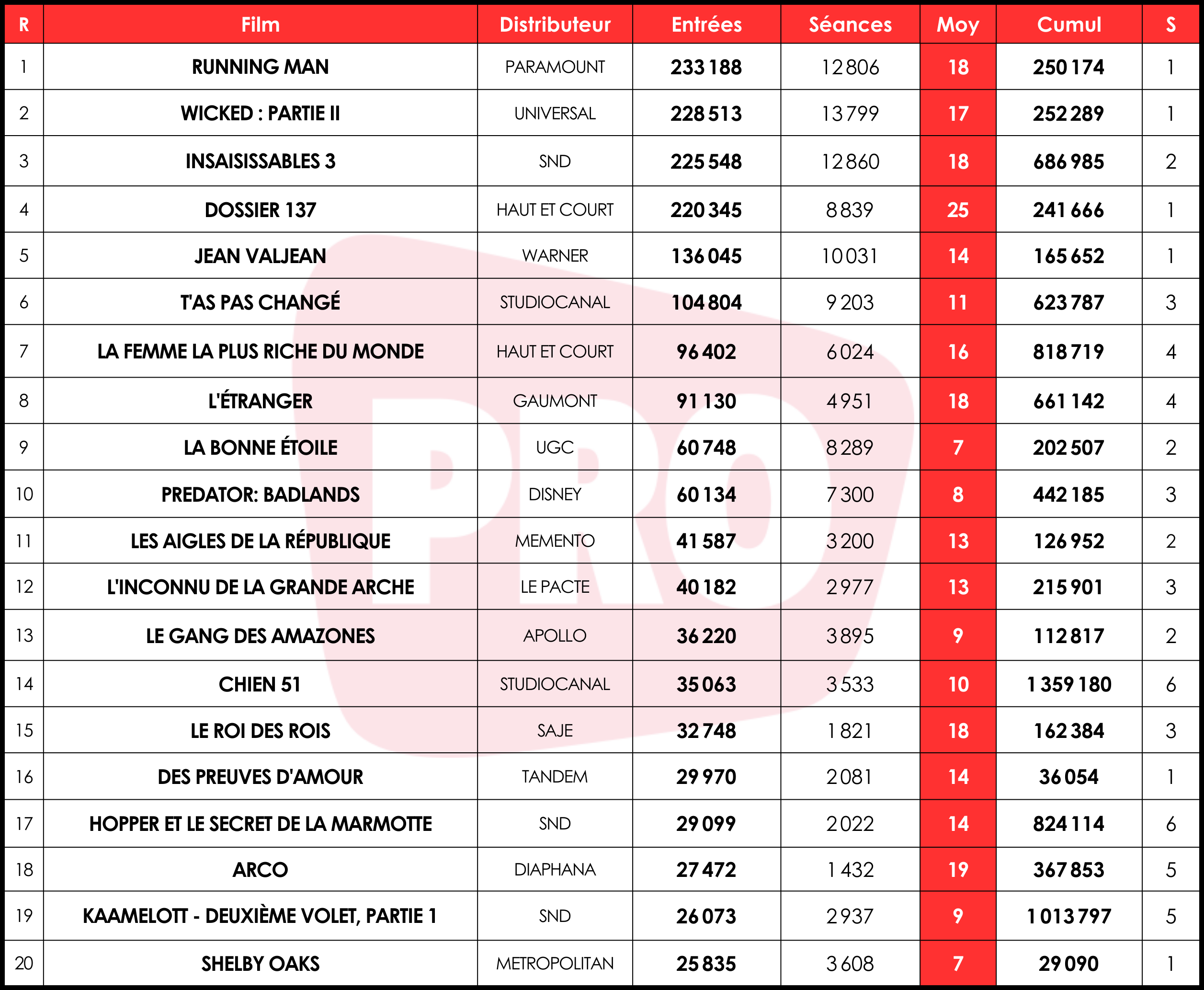 Parmi les continuations, L’Étranger (-31 %) attire encore 90 000 cinéphiles en quatrième semaine et totalise plus de 660 000 entrées, devenant le plus gros succès pour un film en noir et blanc depuis The Artist, 3 millions de billets en 2011. L’animation Le Roi des rois affiche la meilleure tenue du classement (-24 %) à la faveur d’une programmation stable (-2 % de séances) et cumule 163 000 entrées en trois semaines.
