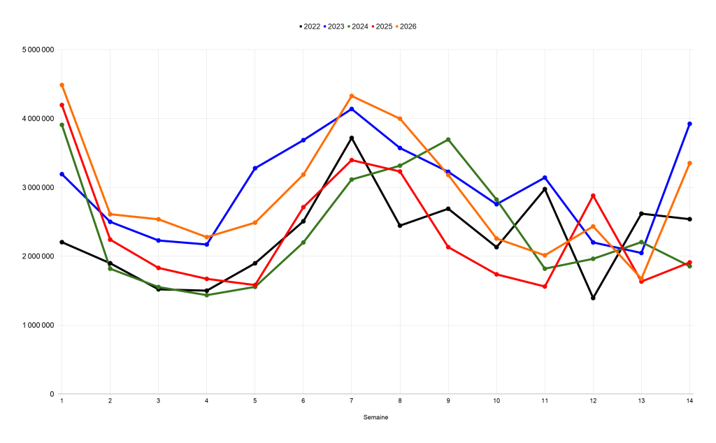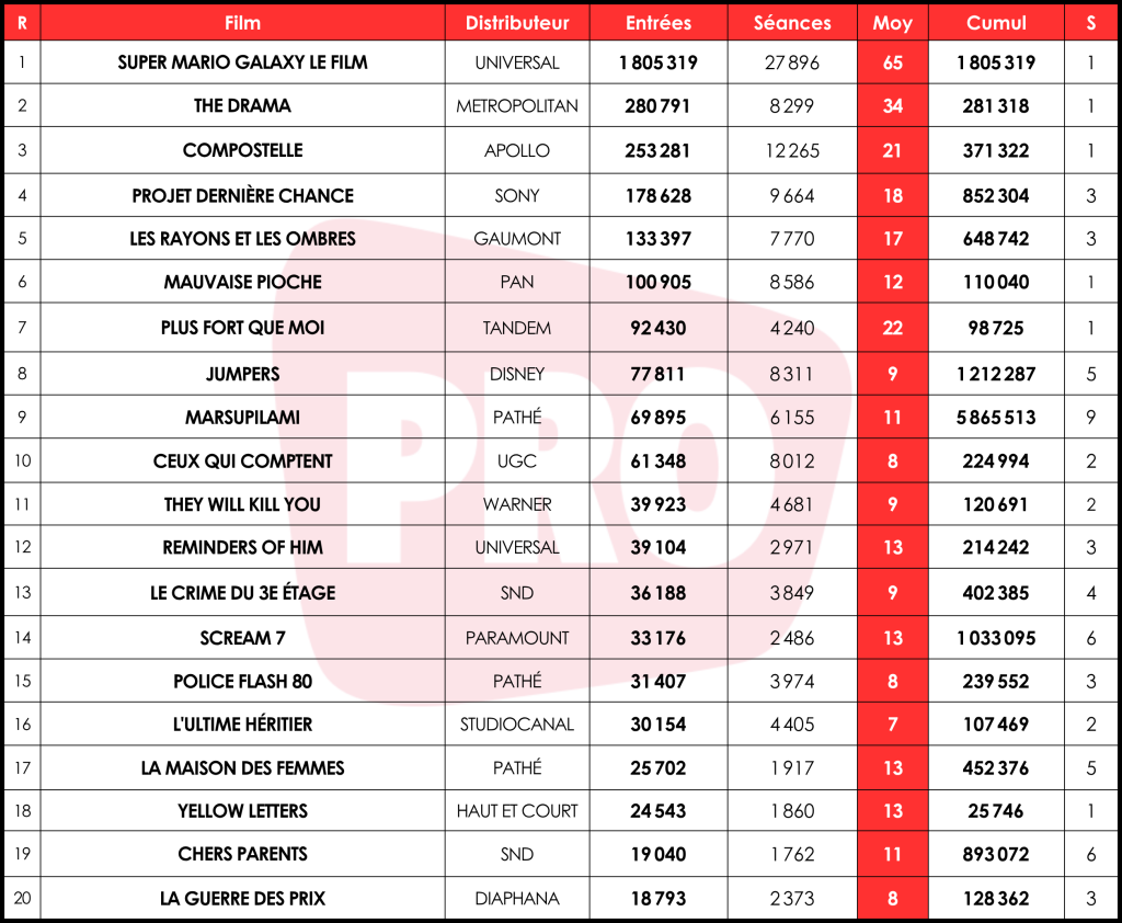 Au total, le top 20 hebdomadaire totalise plus de 3,3 millions d’entrées, en nette progression par rapport à la semaine précédente (+100 %) grâce à Super Mario Galaxy. Il s’agit par ailleurs de la deuxième meilleure semaine enregistrée à cette période sur les cinq dernières années après 2023, signal positif d’un mois d’avril qui démarre sur des bases encourageantes après la déception du mois de mars.