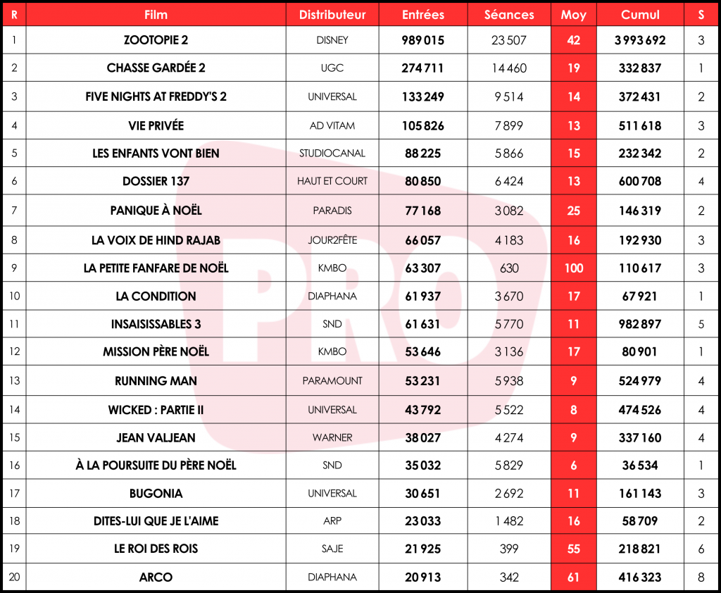 Zootopie 2 boucle sa troisième semaine juste sous la barre du million de spectateurs mais, fort d’une belle tenue (-22 %), se rapproche encore un peu plus des 4 millions d’entrées. Le film d’animation de Disney affiche un temps d’avance sur Lilo & Stitch, qui totalisait plus de 3,5 millions de billets au même stade, et reste, pour quelques jours encore, le plus gros succès de l’année avec quelque 5,1 millions de spectateurs. La suite de Zootopie reste en revanche loin derrière un autre sequel, Vice-Versa 2, qui cumulait 5,4 millions de tickets en trois semaines, pour un total final au-dessus des 8,5 millions.
