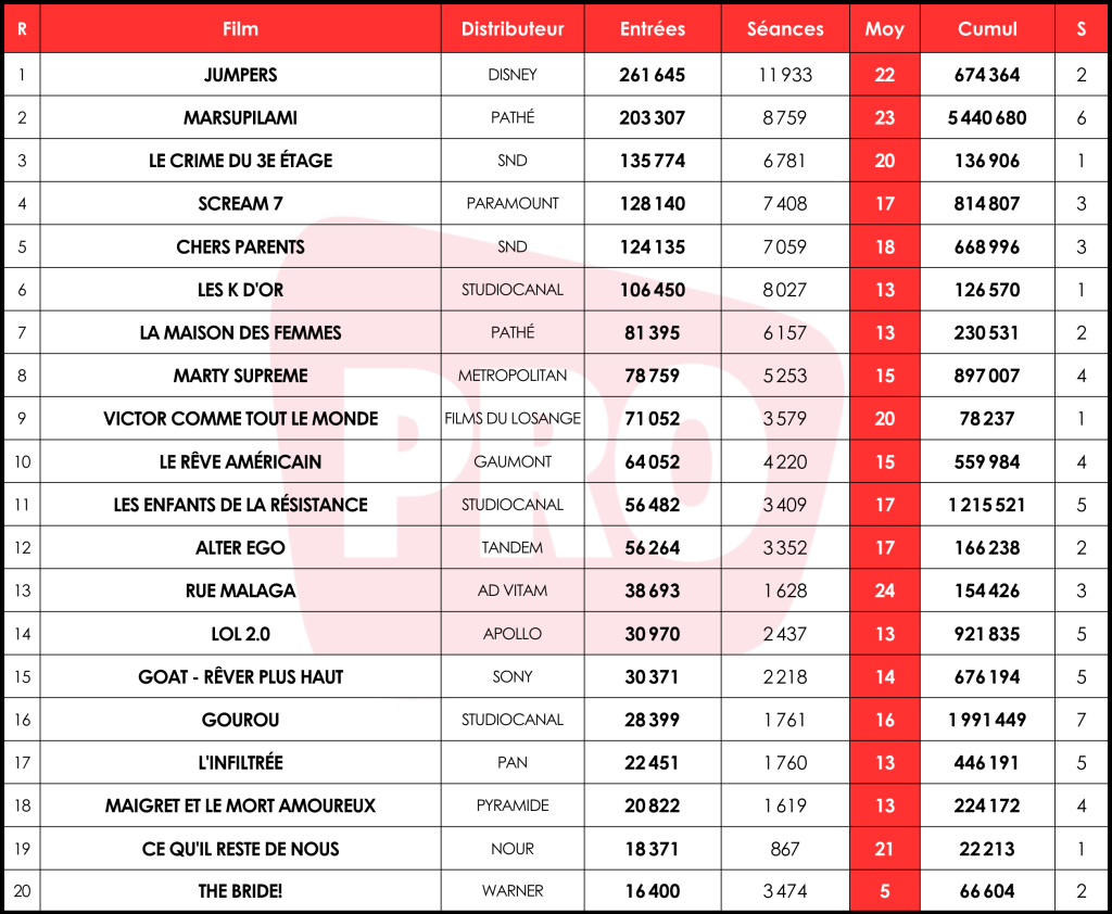 261 000 entrées ont été engrangées par Jumpers pour 22 e/s. L’animation originale de Pixar cumule 674 000 spectateurs, et devance largement le total au même stade de Elio (352 000 entrées, cumul à 1,2 M), mais se positionne derrière Élémentaire (804 000 entrées, cumul à 3,3 M). À noter que ces deux titres ont, sur leur deuxième week-end, bénéficié du boost de la Fête du Cinéma, que Jumpers devrait connaître la semaine prochaine avec le Printemps du Cinéma.