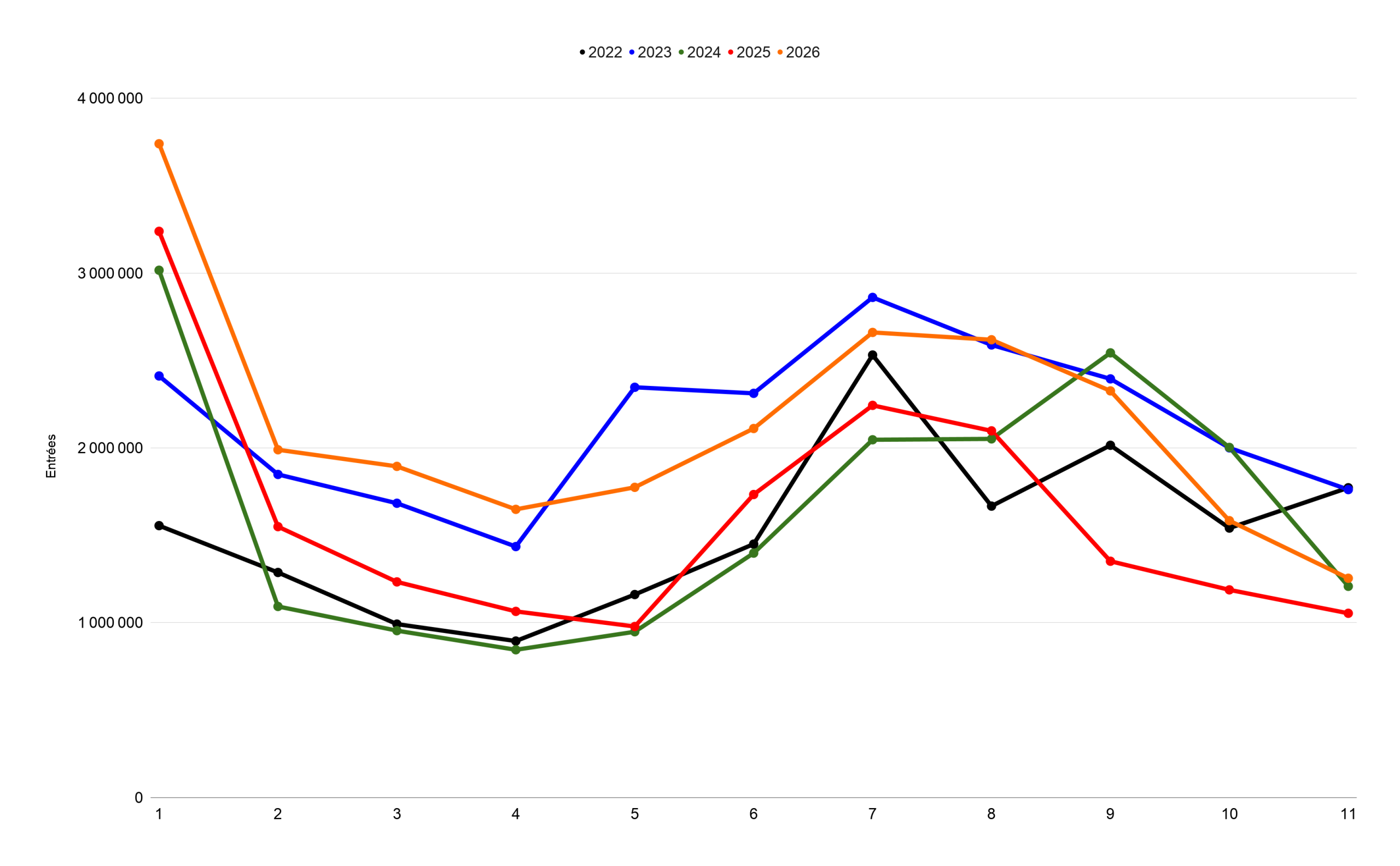 Au total, le top 10 réalise 1,25 M d’entrées, soit une baisse de 20 % par rapport au week-end passé. Le classement conserve une avance face à celui de la période équivalente de 2025 (+19 %) et repasse devant celui de 2024 (+3,8 %), mais reste loin de ceux de 2023 (-28,9 %) et de 2022 (-29,2 %) qui bénéficiaient du Printemps du Cinéma.
