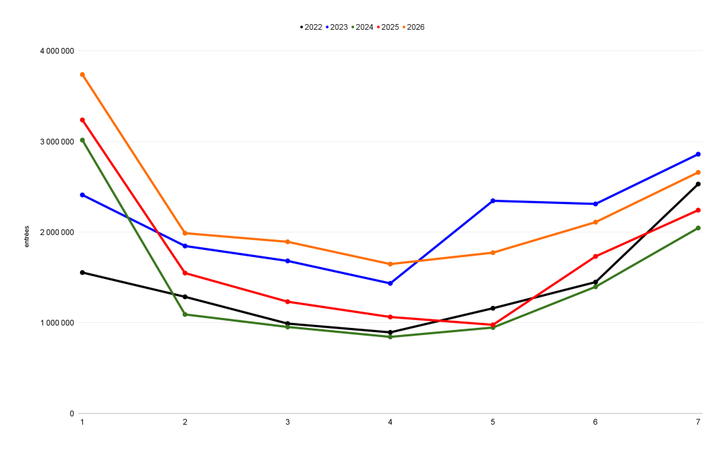 Entrées cumulées du 11 au 15 février 2026 :